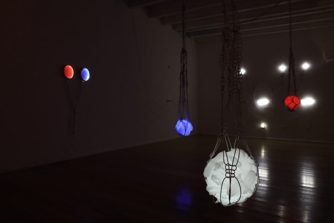 Deep association is a net-like structure of knotted USB extension cords, plugs, LEDs and small square paraffin sculptures which show partly surreal, partly realistic hands, switches, knots, and outlets. The site responsive piece was created for this space as it has an unusual number of outlets on this one wall. The piece is plugged into all of the outlets and is hold up by the plugs. The power travels through the whole knotted structure and lights the LEDs inside the paraffin sculptures.