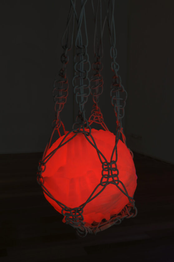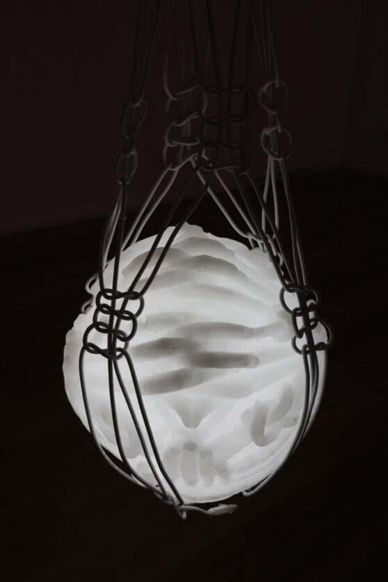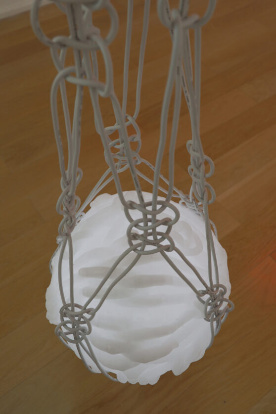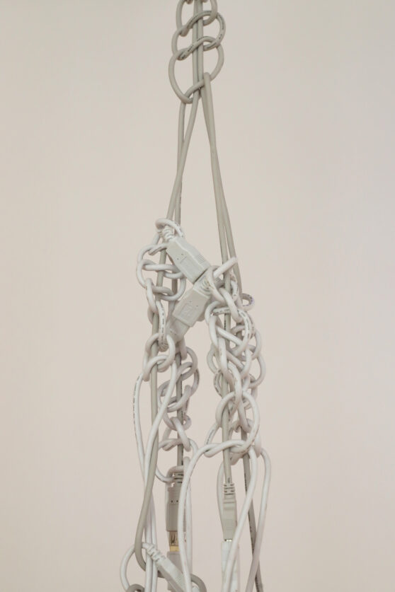 Knotting together usb cables literally and conceptually creates structures of information and power, which form connections, contain, hold, and actually power the sculpted paraffin works which feature reliefs of hands and interwoven structures.