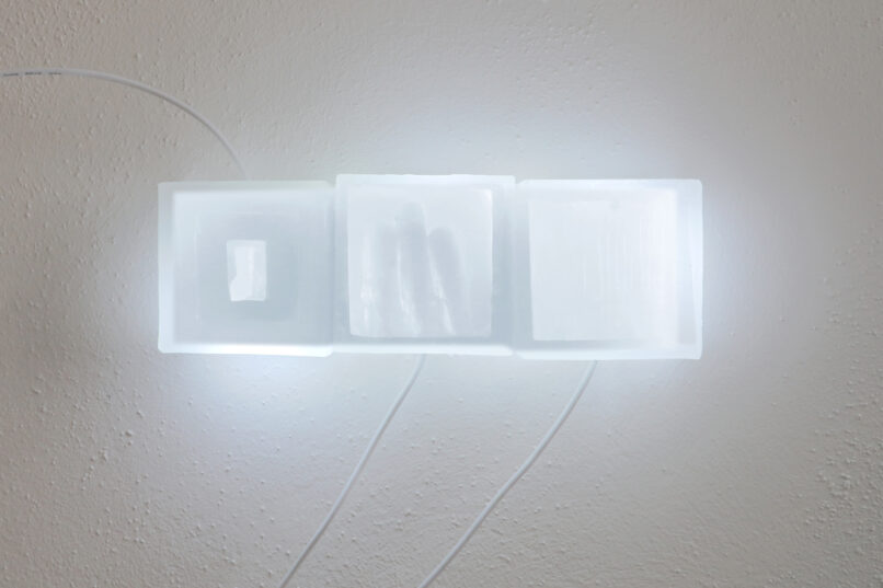 The liquid and solid states of paraffin lie close together, it melts at body temperature. The translucent material has another inherent relationship to light; for centuries it has been used to make candles. Holding shapes, paraffin wax can carry information—as a fingerprint, seal or sculpture. Because of its ability to change its state it references the idea of the ether and also reminds of Descartes’ wax argument which shows that there is an act of judgment involved in perception.
