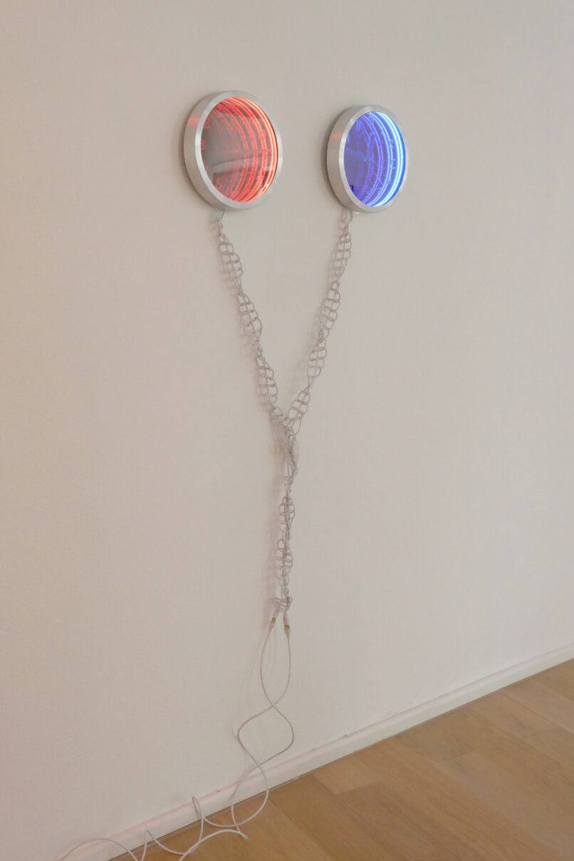 False friends are two clocks, lit from the inside and connected to a timer. Both clocks have double sided mirrors in front of their mirrored faces. When the timer is on, the light inside the clocks is on: the double sided mirrors become transparent and create an infinity effect. When the timer is off, the mirrors are opaque and the viewer just sees their own reflection. The left clock is lit with red light, the right with blue light. I wrote the numbers on the face of the left clock with my left hand in counter clockwise direction. I wrote the numbers of the right clock with my right hand, in clockwise direction but mirrored the numbers. The left clock ticks clockwise, the right clock ticks counterclockwise. In the end both fail in displaying the time but 4 times a day, twice at 12 and 6. Both clocks are connected to each other and the timer with macramé style knotted usb extension cords.