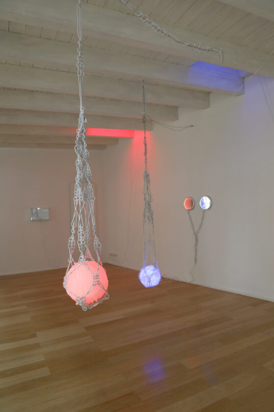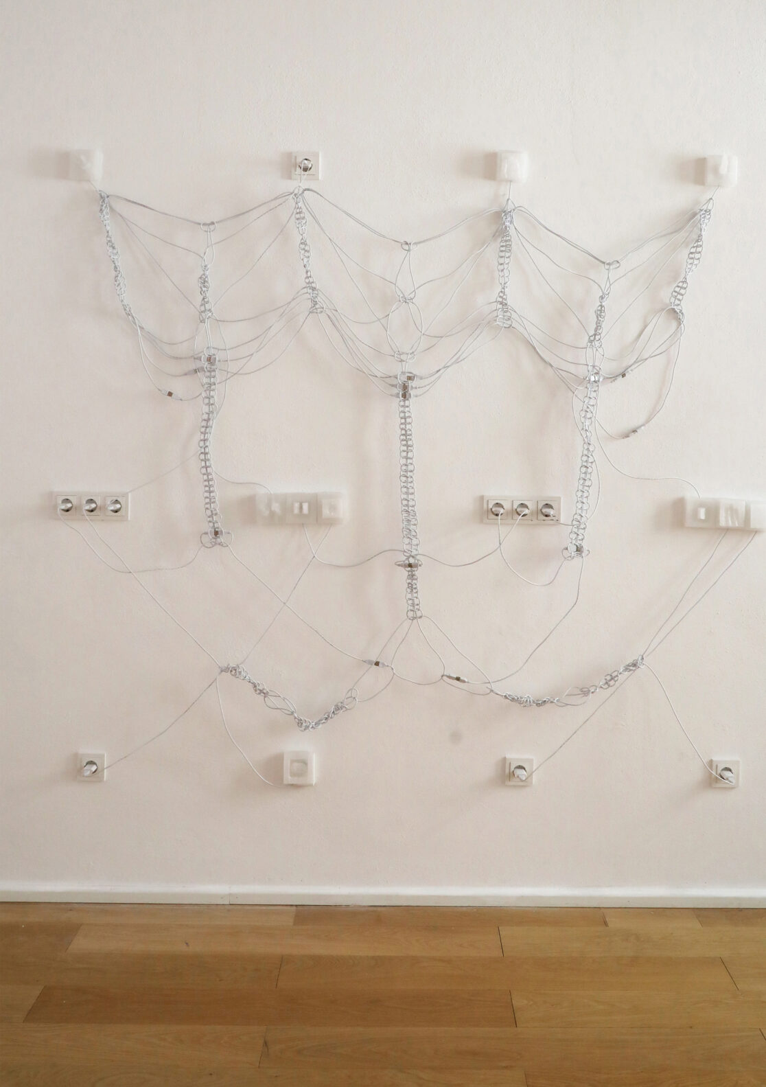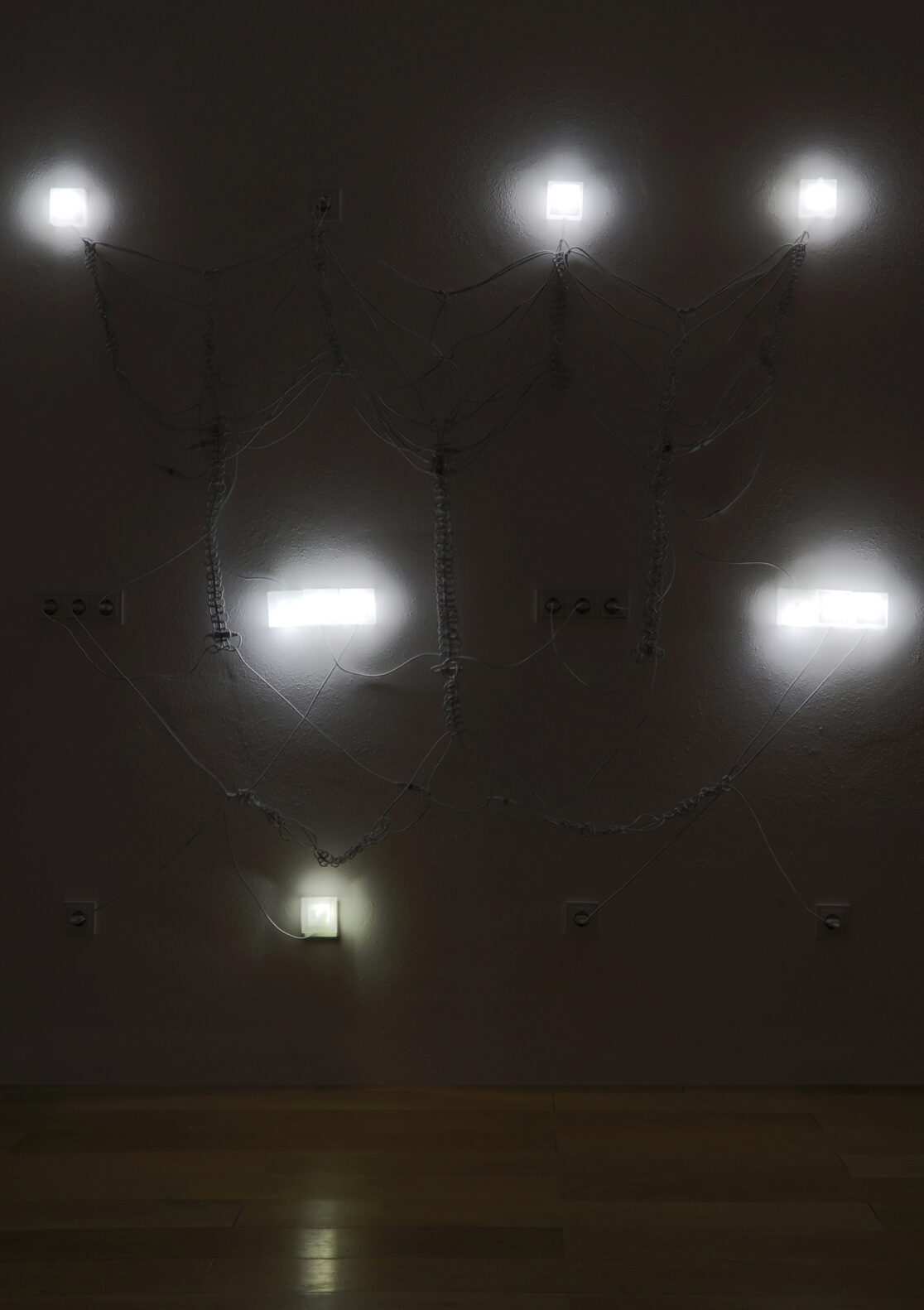 Johanna Strobel’s work conjures up both plan(e)s. There is a longing for principle, apparent in her systematic approach, plug going into socket, light being red or blue, going on or off. We can map this world quite easily on a grid. It is clean, white, metallic. There is also the understanding of a far more dissolute world in which entropy rules, of information lost through USB cables and mnemonic devices of knot-making failing. This world is unstable, reckless, and somehow also inexplicably present.