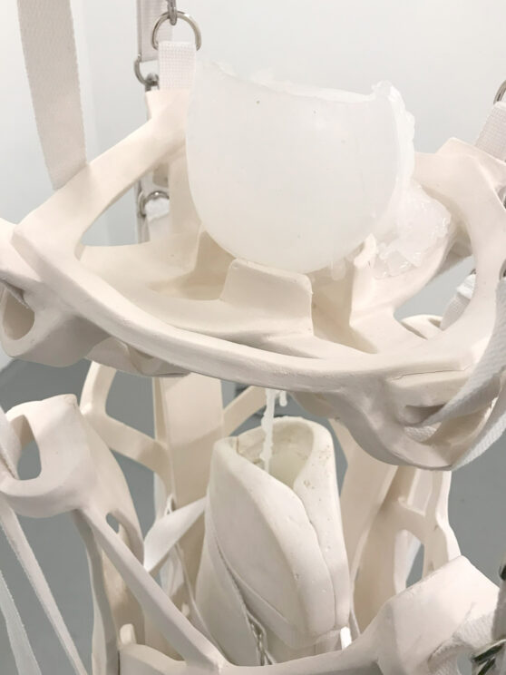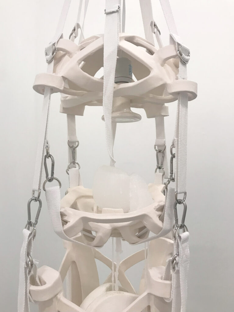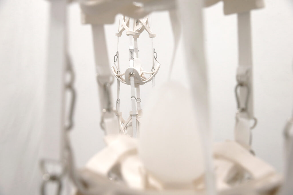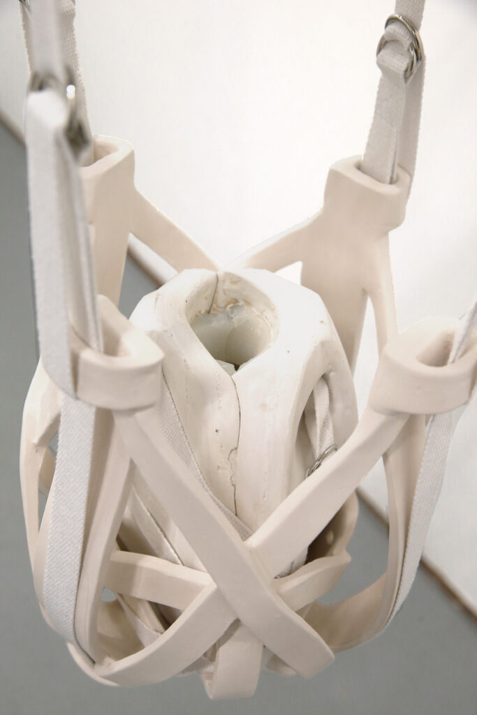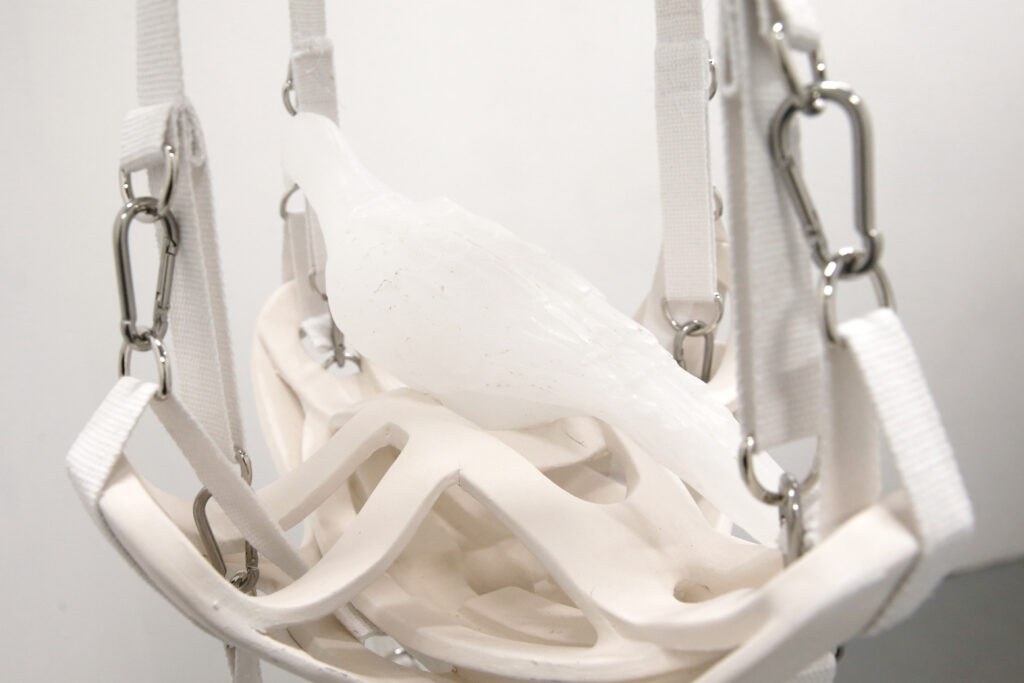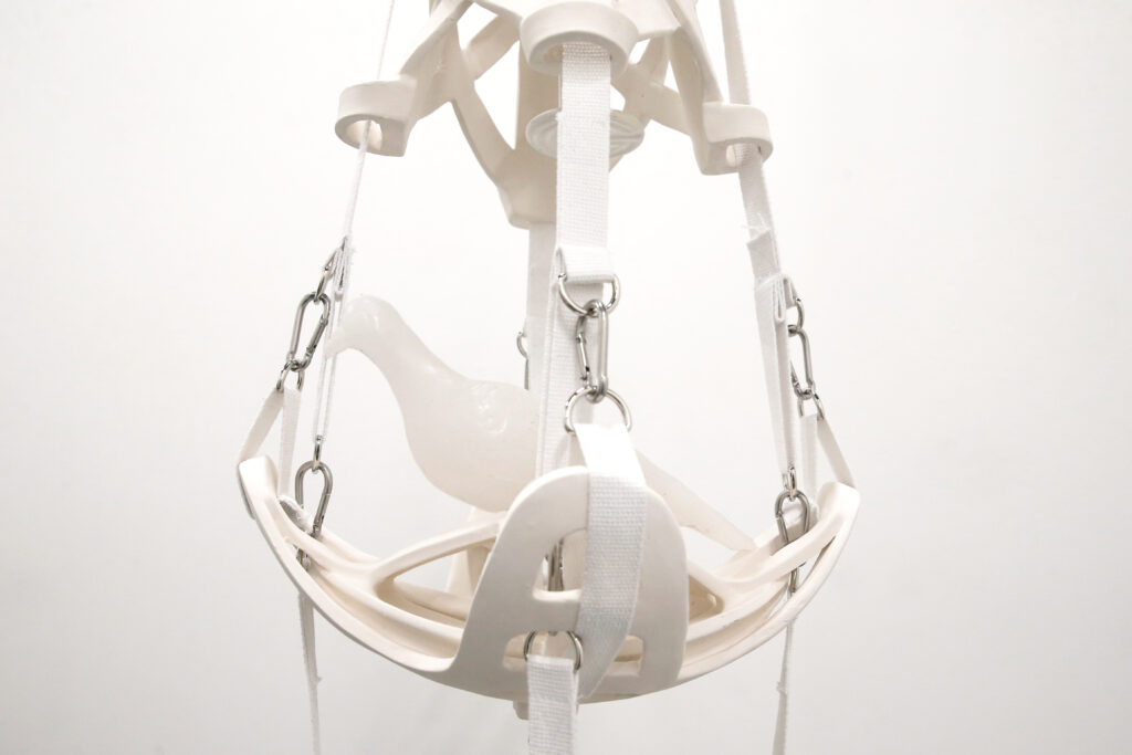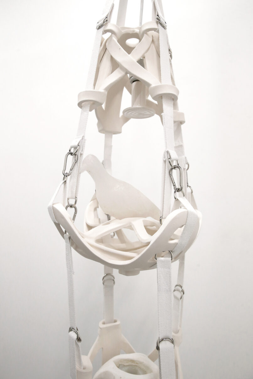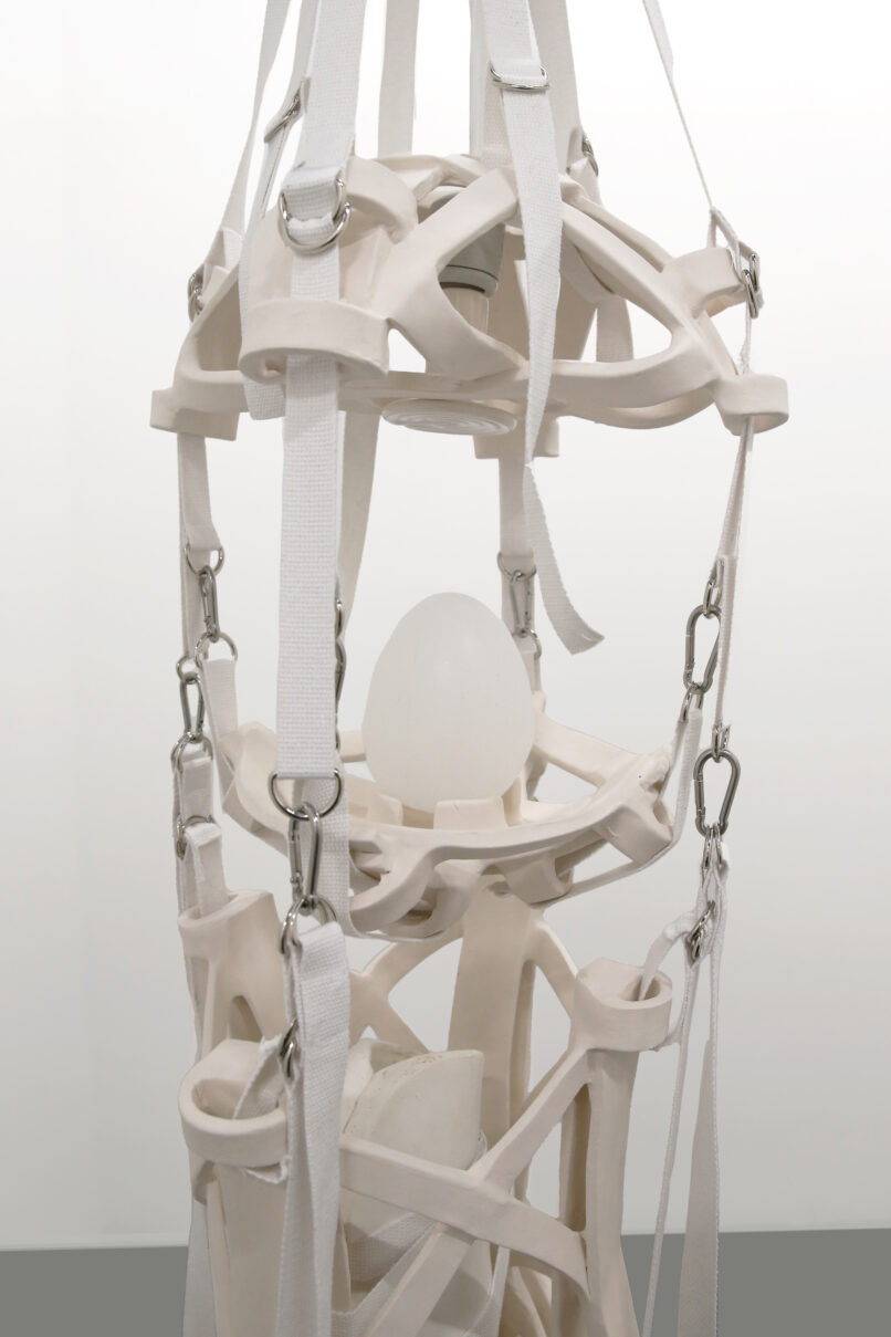 The two hanging sculptures create a circular system. Both consist of multiple ceramic parts connected with straps and fasteners and contain infrared heating elements as well as a mold of a bird and egg respectively.