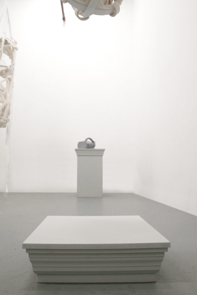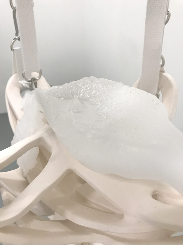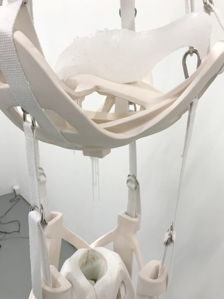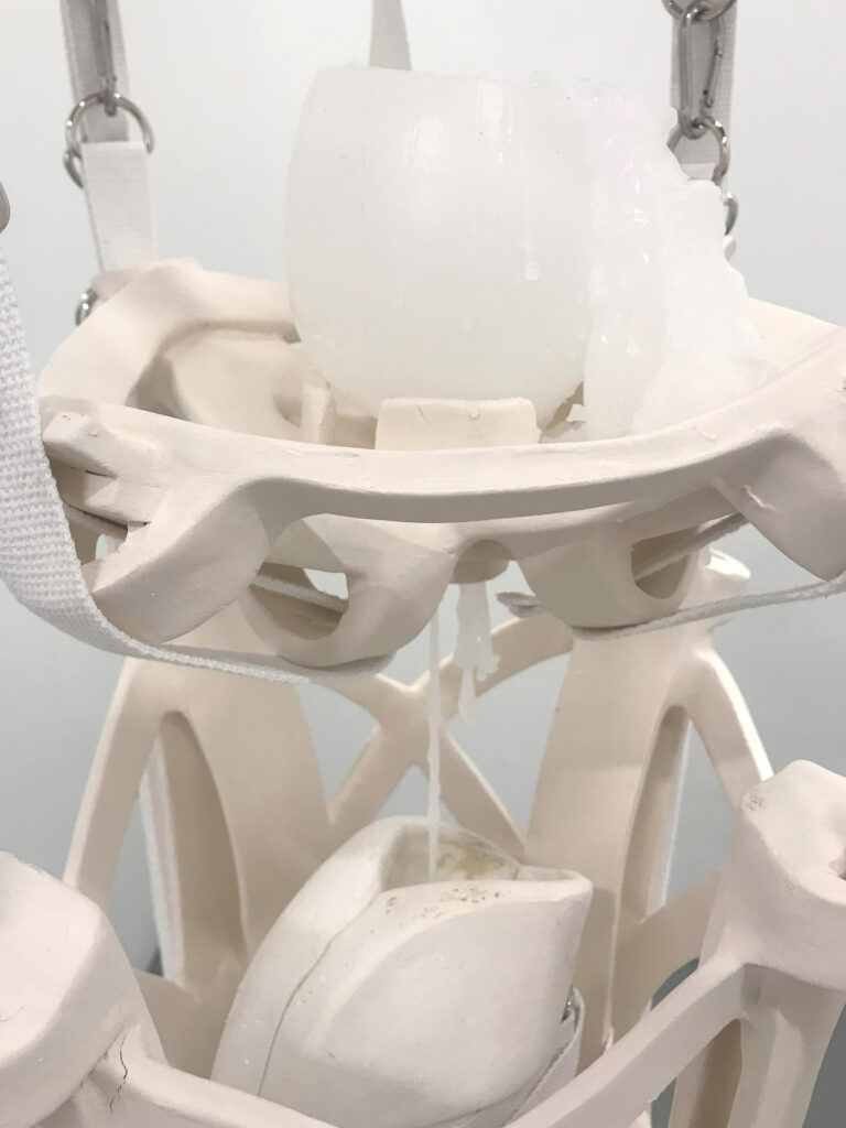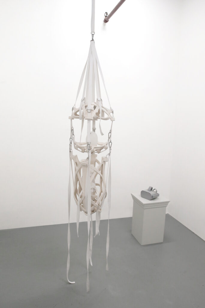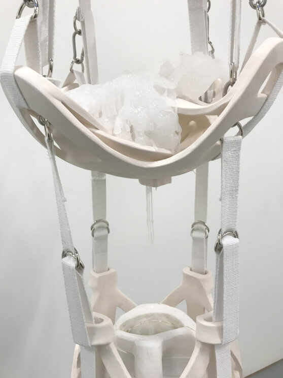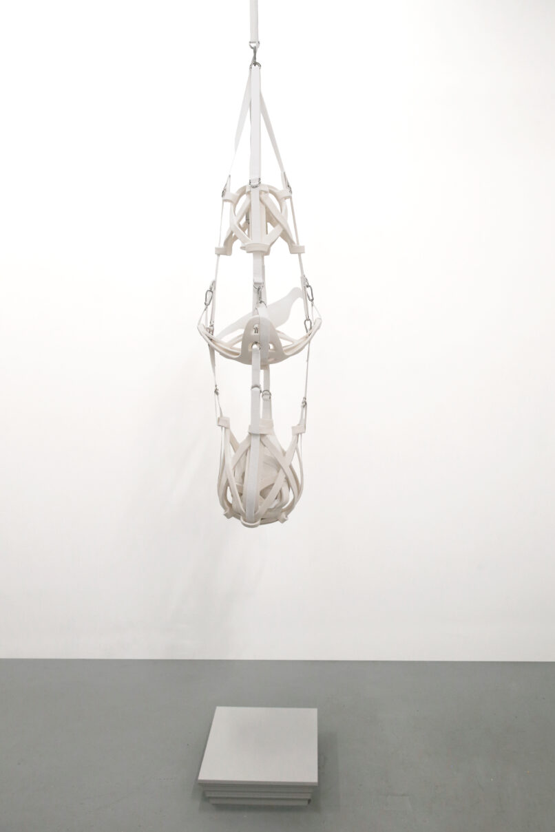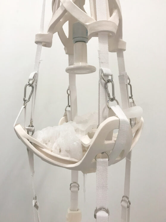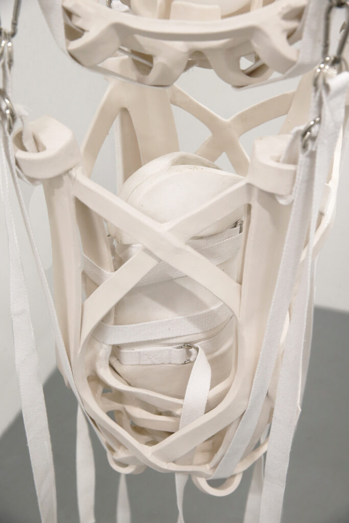 The two hanging sculptures create a circular system. Both consist of multiple ceramic parts connected with straps and fasteners and contain infrared heating elements as well as a mold of a bird and egg respectively.