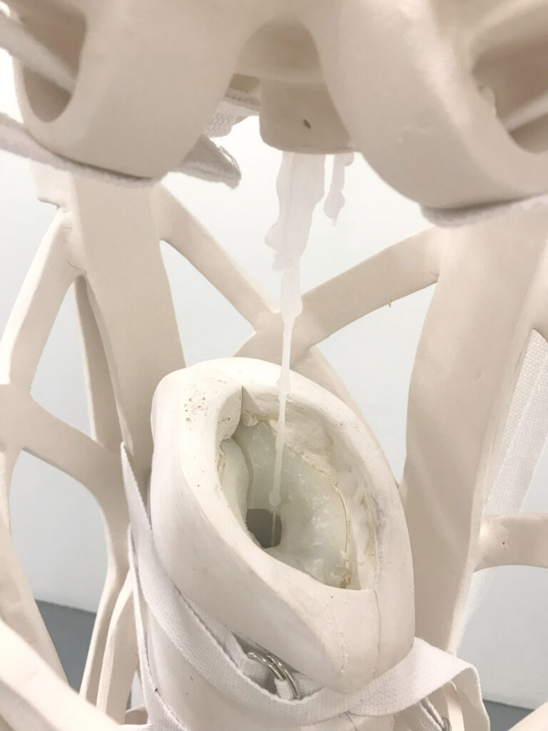 Together the sculptures function in a way like an hourglass: A wax bird is placed in the top part of the first sculpture. The heating element gradually melts the wax bird, causing it to drip into the lower part of the sculpture where an egg-shaped mold captures the wax. Once the wax egg is removed from the mold, it can be placed onto the sister sculpture and the process is reversed: the wax egg melts into a bird-shaped mold. With every iteration some of the wax evaporates, so that in the end just fragments of birds and eggs are cast and remelted until all the wax is gone – the cycle accelerates until it stops.