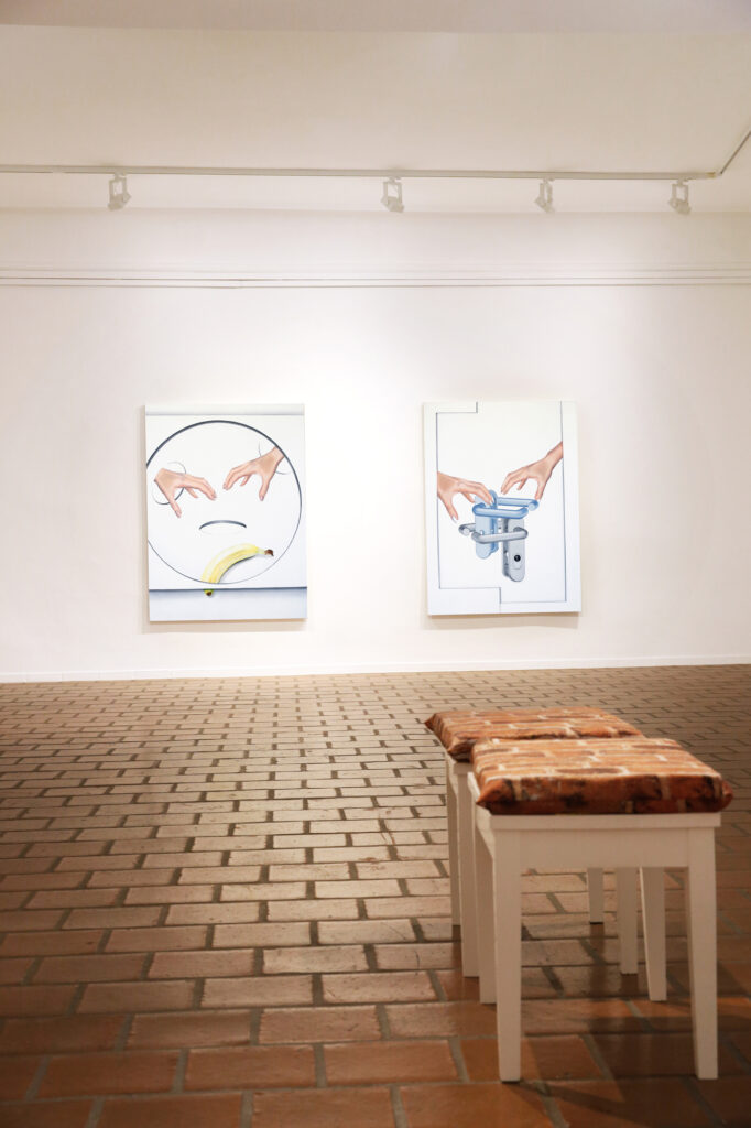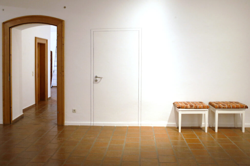 For her exhibition ON HOLD ON at Städtische Galerie Cordonhaus Cham Johanna Strobel extensively transformed the space. She built walls in front of the windows so that now peepholes open up unfamiliar perspectives on satellite dishes, distorting mirrors, or an index finger pointing back to the observer where these windows used to be. Trompe l'oeil wall paintings of doors create the perfect illusion of additional rooms.
