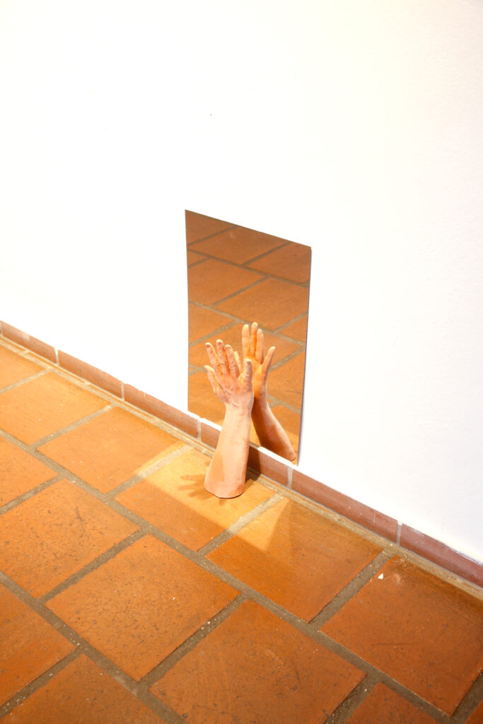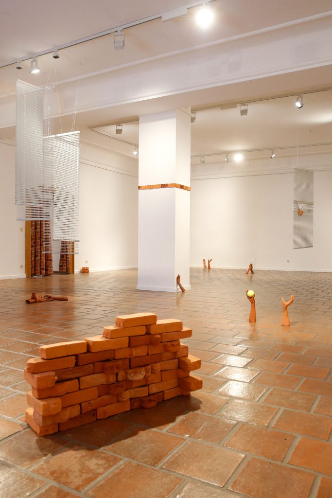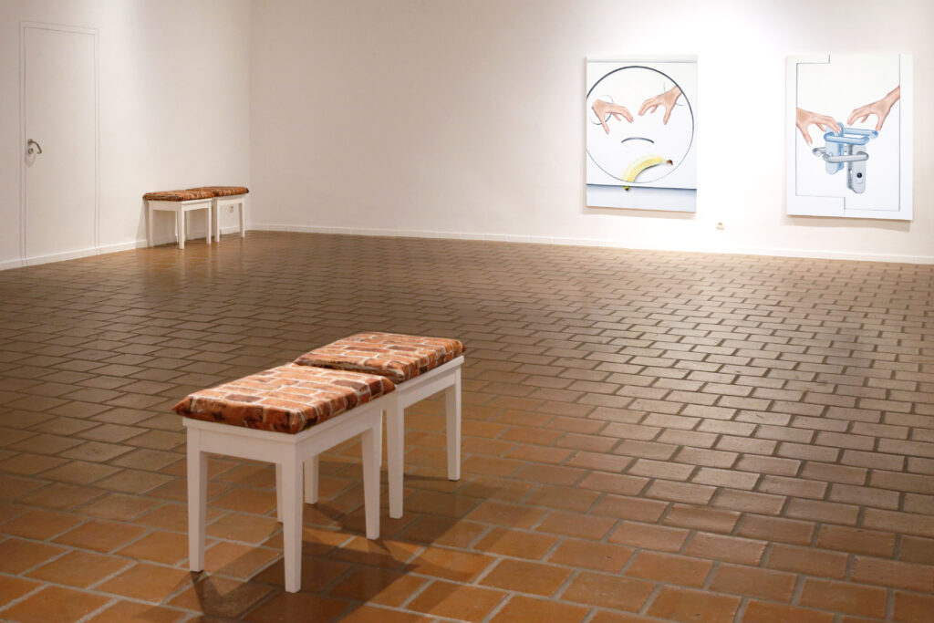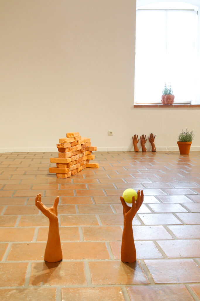 Strobel works with the room, not against it. Directly referring to the terracotta floor of the Renaissance building, Strobel shows terracotta multiples, which seem as if the floor itself has produced the sculptures. The terracotta or brick motif is also found on the pillowcases of the museum stools or the curtain through which, as through the wall, one of the rooms has to be entered.