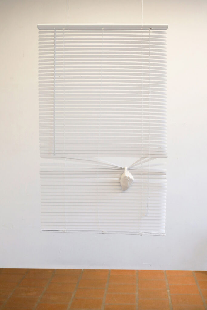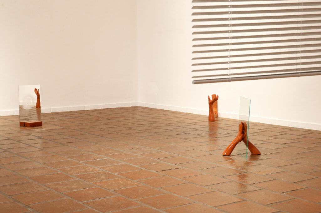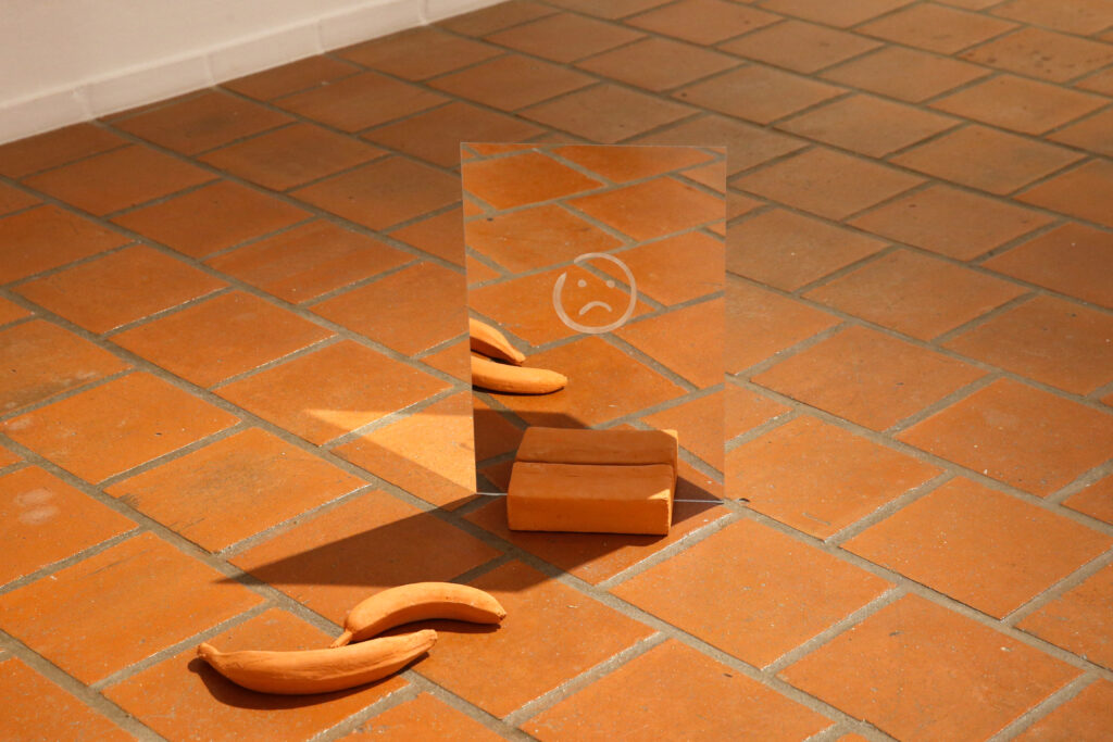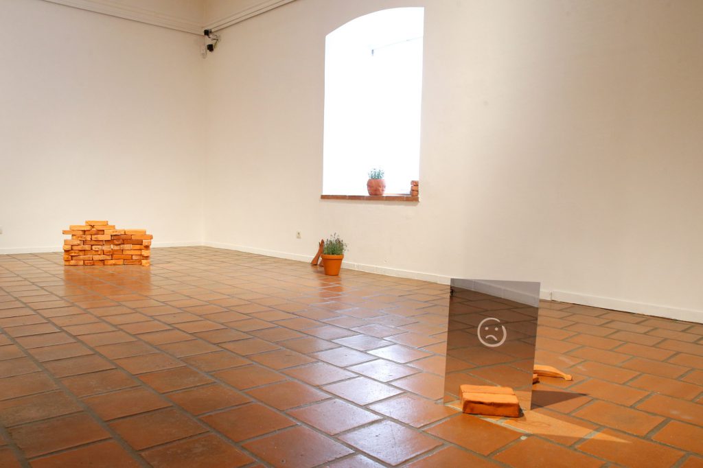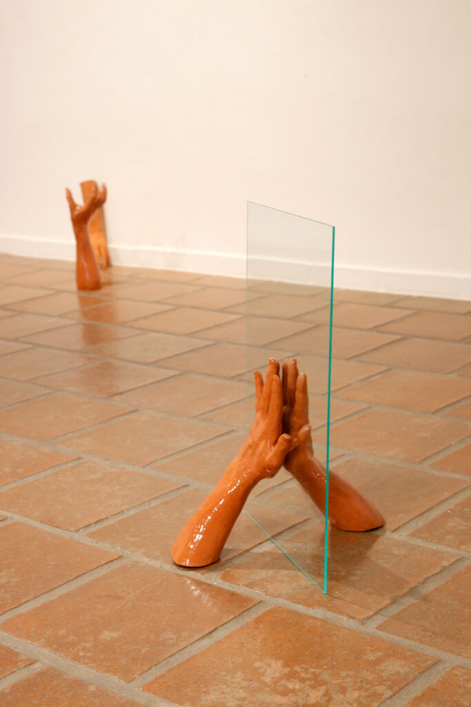 Strobel works with the room, not against it. Directly referring to the terracotta floor of the Renaissance building, Strobel shows terracotta multiples, which seem as if the floor itself has produced the sculptures. The terracotta or brick motif is also found on the pillowcases of the museum stools or the curtain through which, as through the wall, one of the rooms has to be entered.