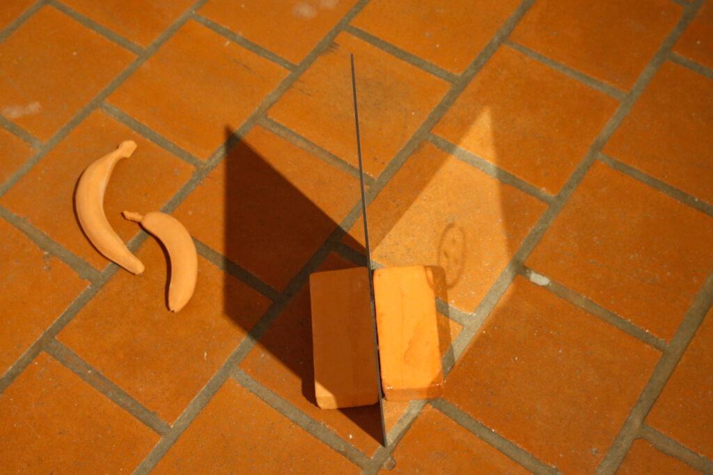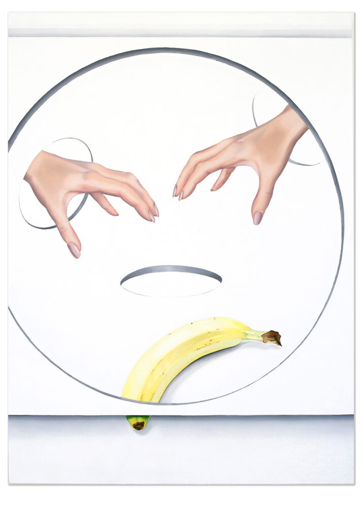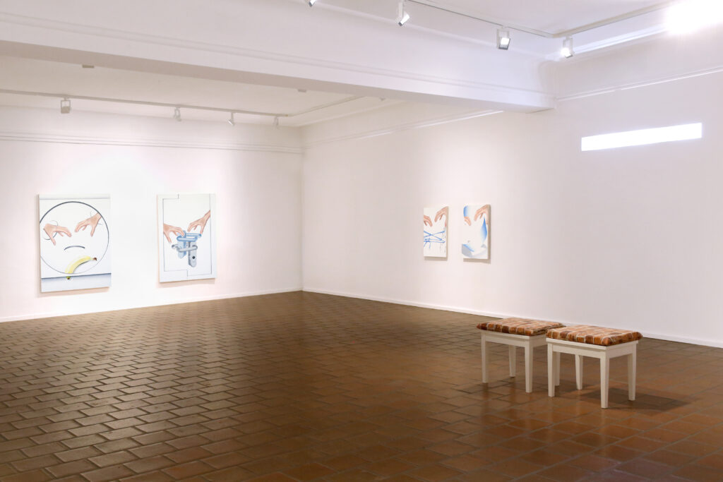 Strobel’s paintings do not depict real spaces or possible architectures in which narrative situations take place; her sculptures open up a linguistic space rather than a spatial one. She develops abstract scenes that are both axiomatic and enigmatic, and in which different forms and elements meet. Her own idiosyncratic logic and her use of (impossible) structures, serve her as a mental springboard. She uses a pool of recurring motifs like hands, tennis balls, bananas or door handles, to explore how objects, as things observed and perceived by subjects, achieve meaning - general and personal.