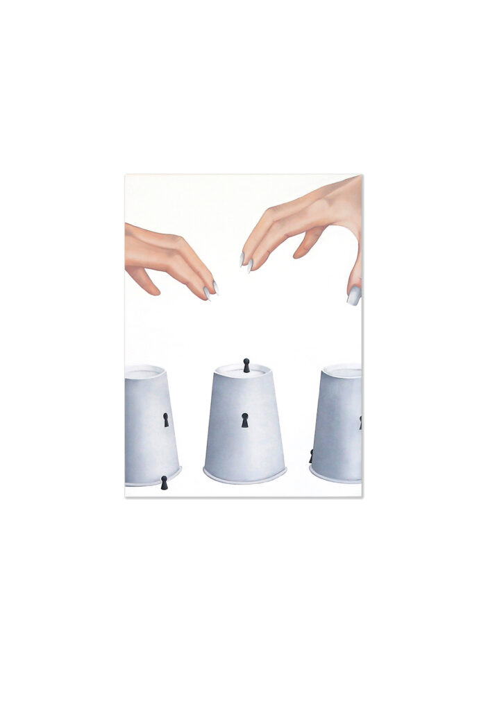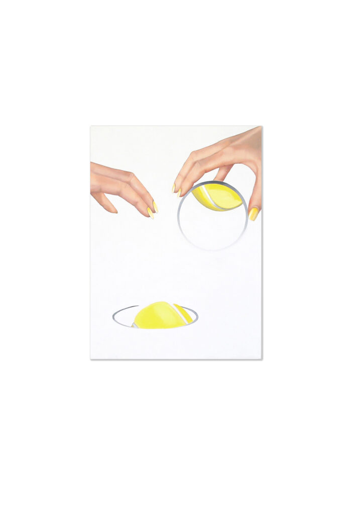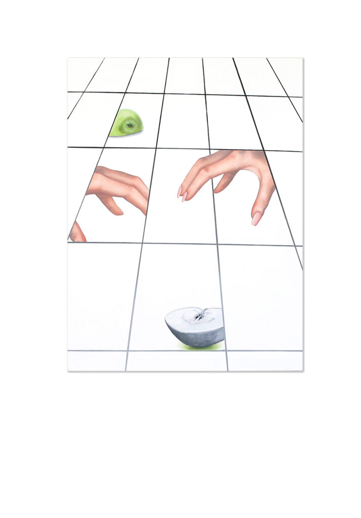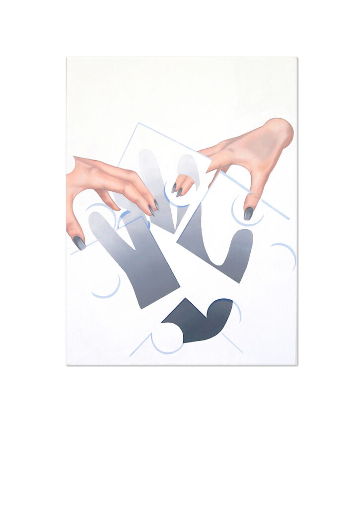 To the hands, which remain identical except for the color of the nail polish, changing elements or motifs are added. In complex spatial situations, the manicured hands reach into cavities or protrude out of them and are combined with other systems of representation: pictogram-like elements, line drawings and geometrical shapes which sometimes create volumes, sometimes cavities, intersecting or nesting inside each other.