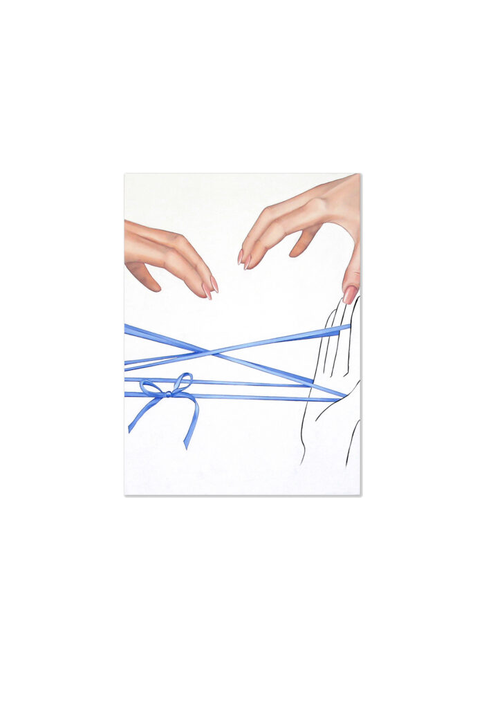 All paintings in this series show two identical (mirrored) hands. While in all paintings these hands have the same actual size, the size of the canvas and thereby the detail and proportion of the hands varies in relation to the size of the painting.
