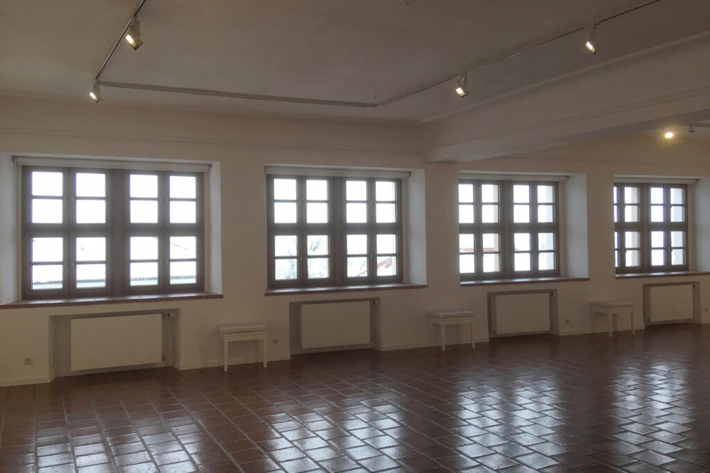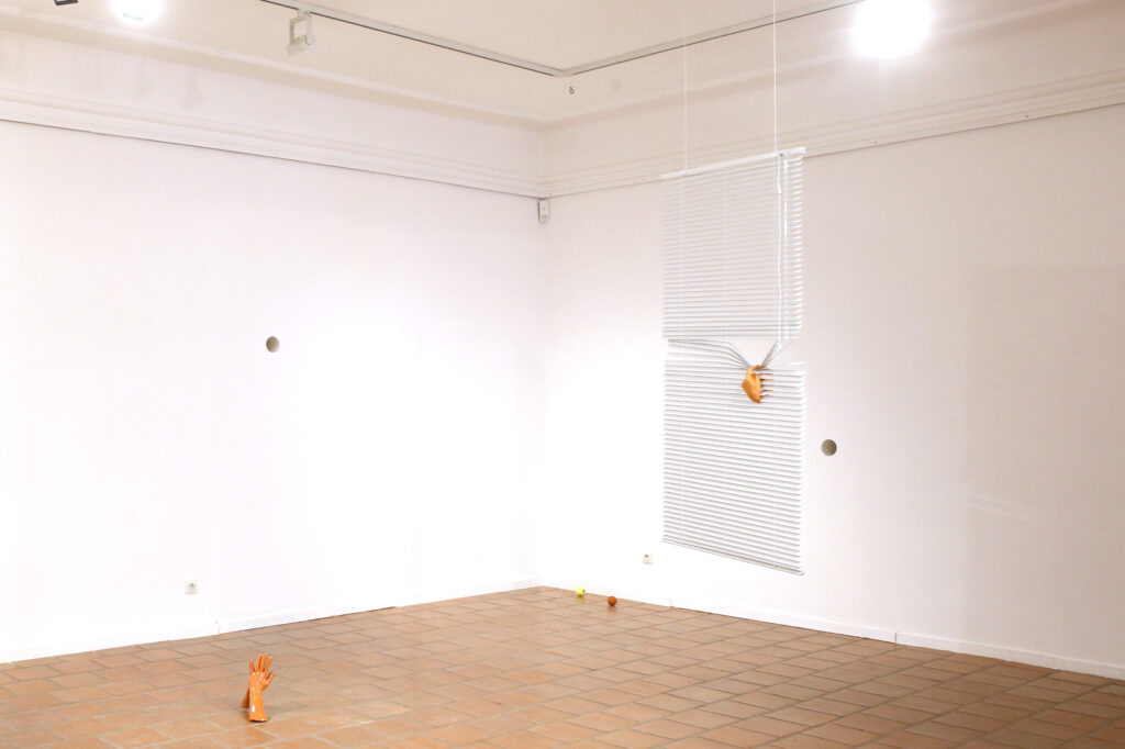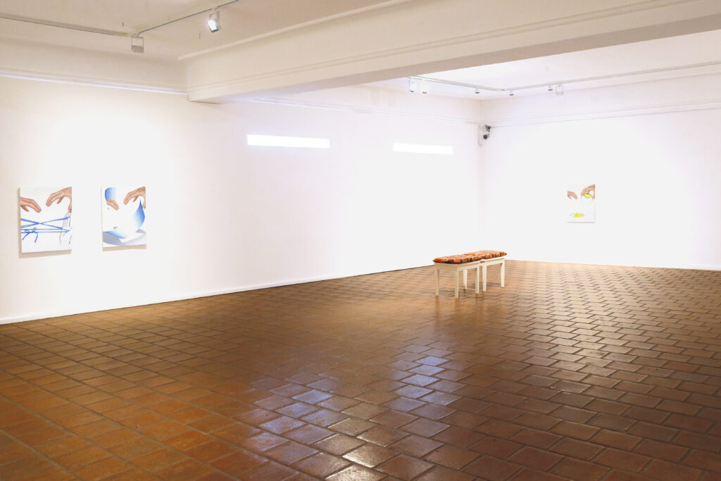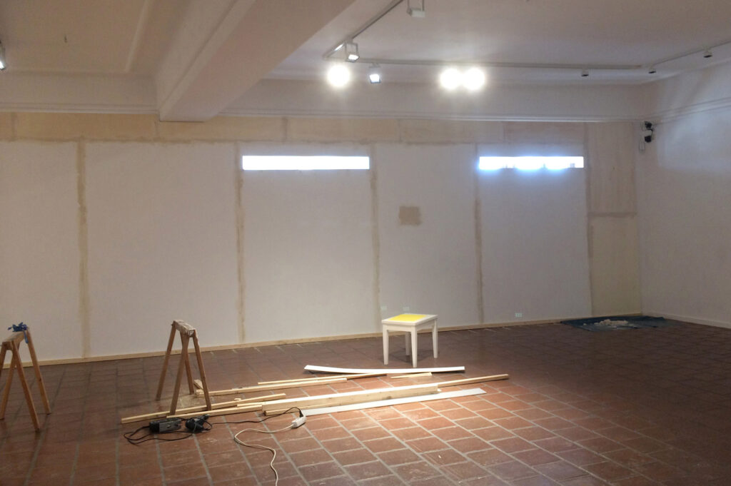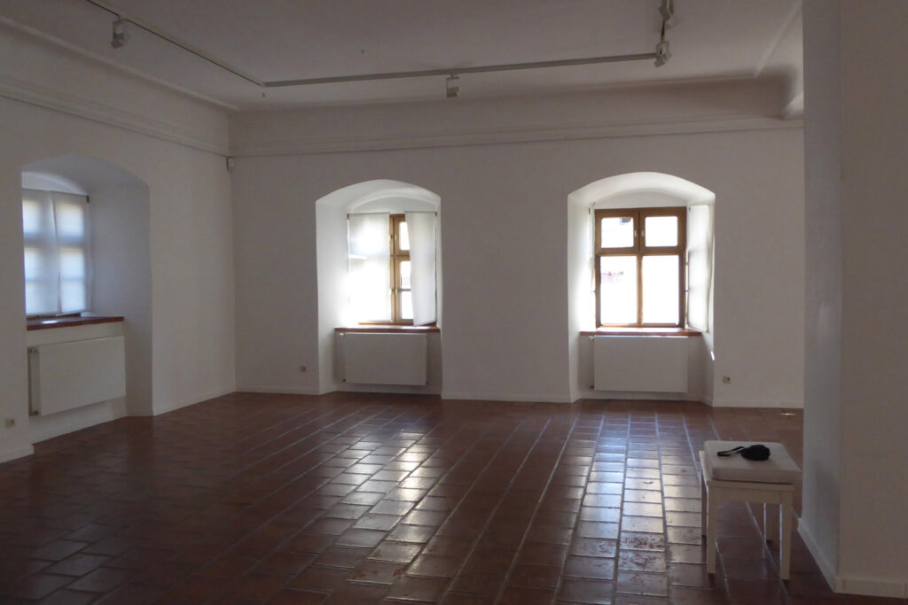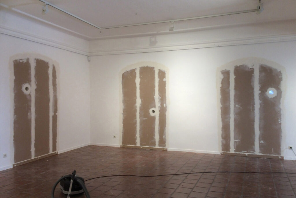 For her exhibition ON HOLD ON at Städtische Galerie Cordonhaus Cham Johanna Strobel extensively transformed the space. She built walls in front of the windows so that now peepholes open up unfamiliar perspectives on satellite dishes, distorting mirrors, or an index finger pointing back to the observer where these windows used to be. Trompe l'oeil wall paintings of doors create the perfect illusion of additional rooms.