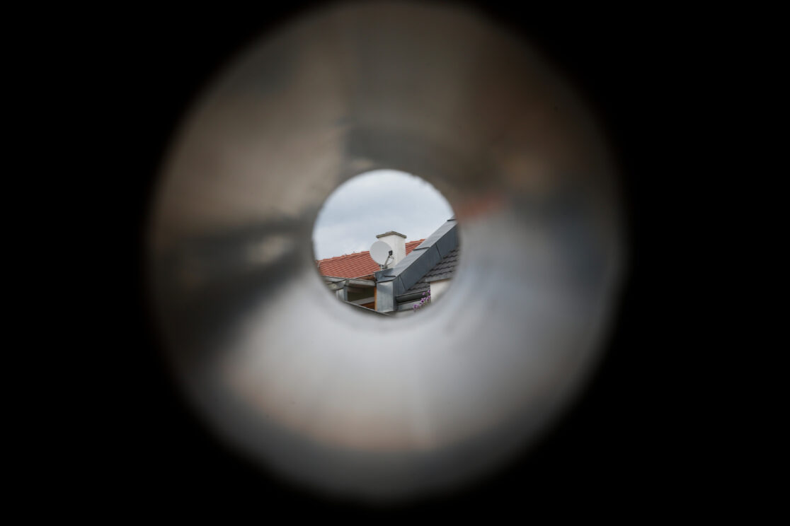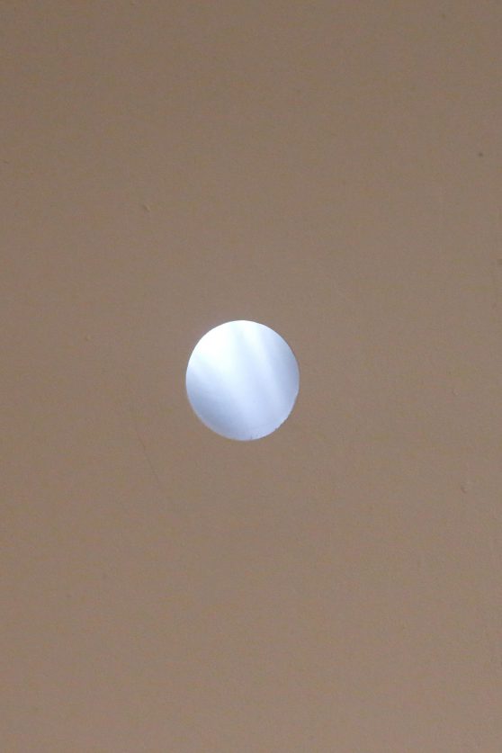 For her exhibition ON HOLD ON at Städtische Galerie Cordonhaus Cham Johanna Strobel extensively transformed the space. She built walls in front of the windows so that now peepholes open up unfamiliar perspectives on satellite dishes, distorting mirrors, or an index finger pointing back to the observer where these windows used to be. Trompe l'oeil wall paintings of doors create the perfect illusion of additional rooms.