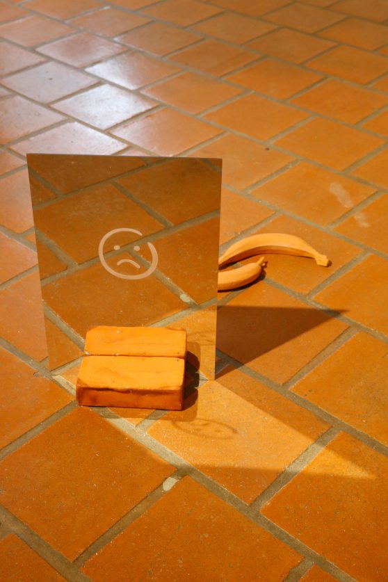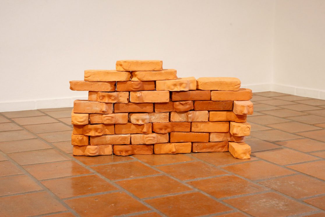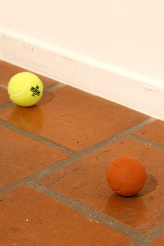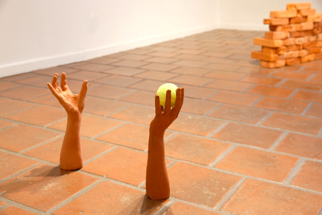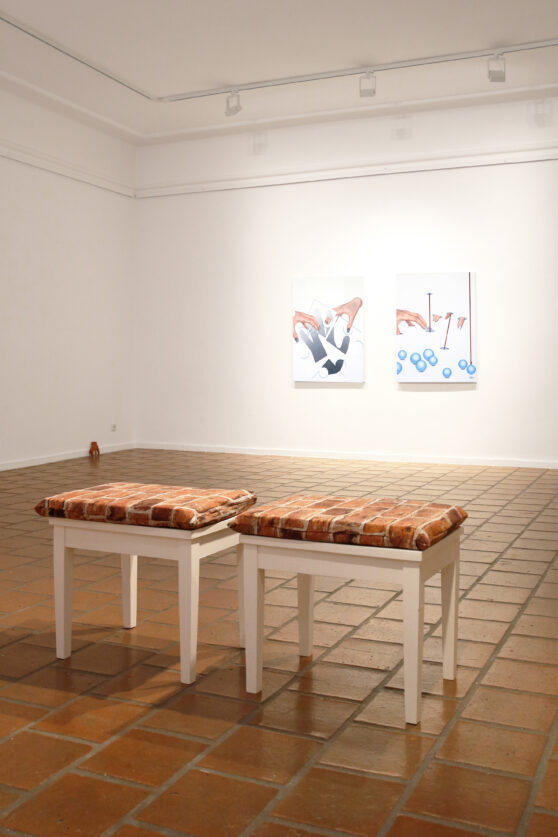 Strobel works with the room, not against it. Directly referring to the terracotta floor of the Renaissance building, Strobel shows terracotta multiples, which seem as if the floor itself has produced the sculptures. The terracotta or brick motif is also found on the pillowcases of the museum stools or the curtain through which, as through the wall, one of the rooms has to be entered.