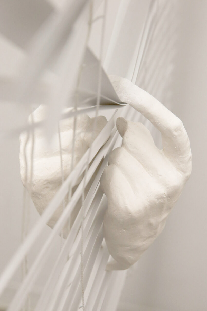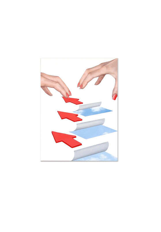 To the hands, which remain identical except for the color of the nail polish, changing elements or motifs are added. In complex spatial situations, the manicured hands reach into cavities or protrude out of them and are combined with other systems of representation: pictogram-like elements, line drawings and geometrical shapes which sometimes create volumes, sometimes cavities, intersecting or nesting inside each other.
