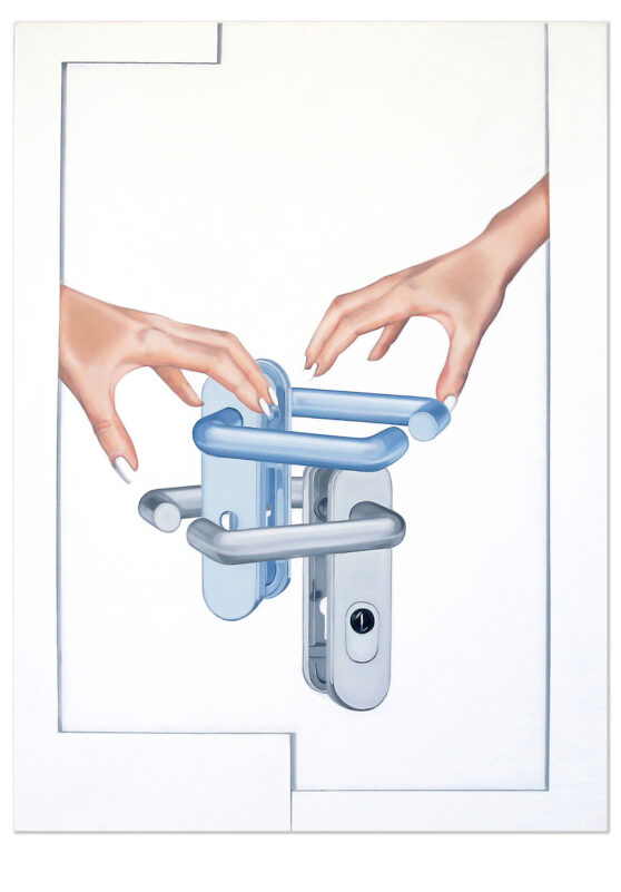 The pictorial space becomes a system in which forms and objects can be combined to different chains of meaning. Depending on how structure and module relate to each other, the gestures embodied by the hands, and the linguistic access to them, change: access, intervene, reach into, grasp, let go, or hold on to.