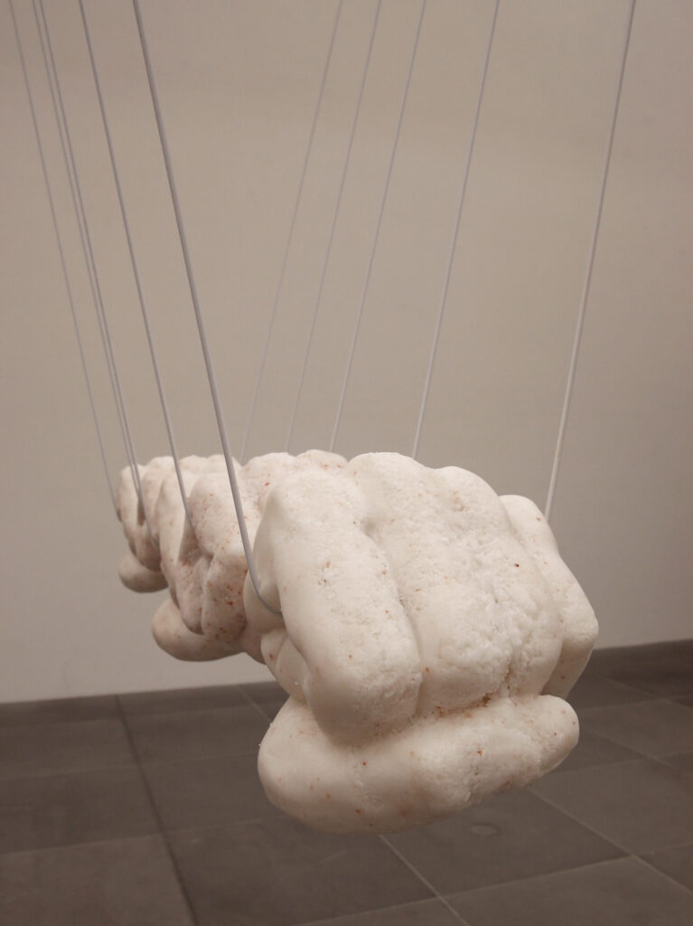Once activated the cocoon of the salt fists breaks open piece by piece, with every swing and reveals the ceramic knot while the salt crust falls to the floor where it remains as a relic of change. The activation is repeated weekly, each time changing the sculpture and movement irreversibly.