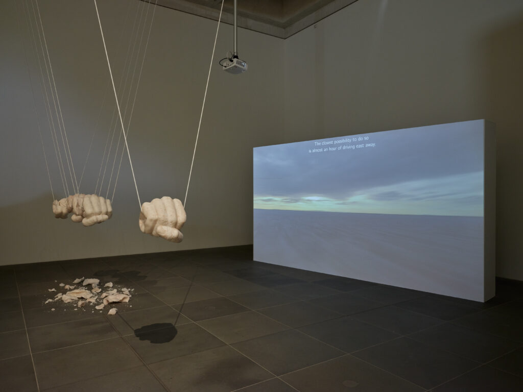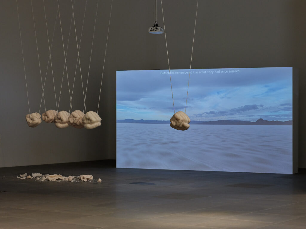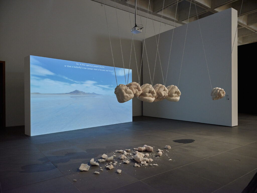 Tracing the fissured landscape of the Bonneville Salt Flats, the installation explores concepts of the here and now, the relationship of change and time, and one’s standpoint in a world that is undergoing major changes due to human influences. A broken sculpture forming a Newton’s pendulum speaks to moments past.