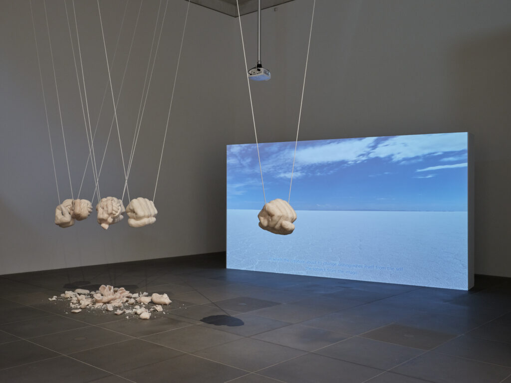 The sculptures made from salt are shaped like double-sided fists. Each contains a ceramic core formed like a knot. The symbol of the fist speaks to change, a revolutionary force and transformation, while the knot inside is unsolvable, infinite, eternal. They form a Newton’s Pendulum – visualizing the conservation of momentum.