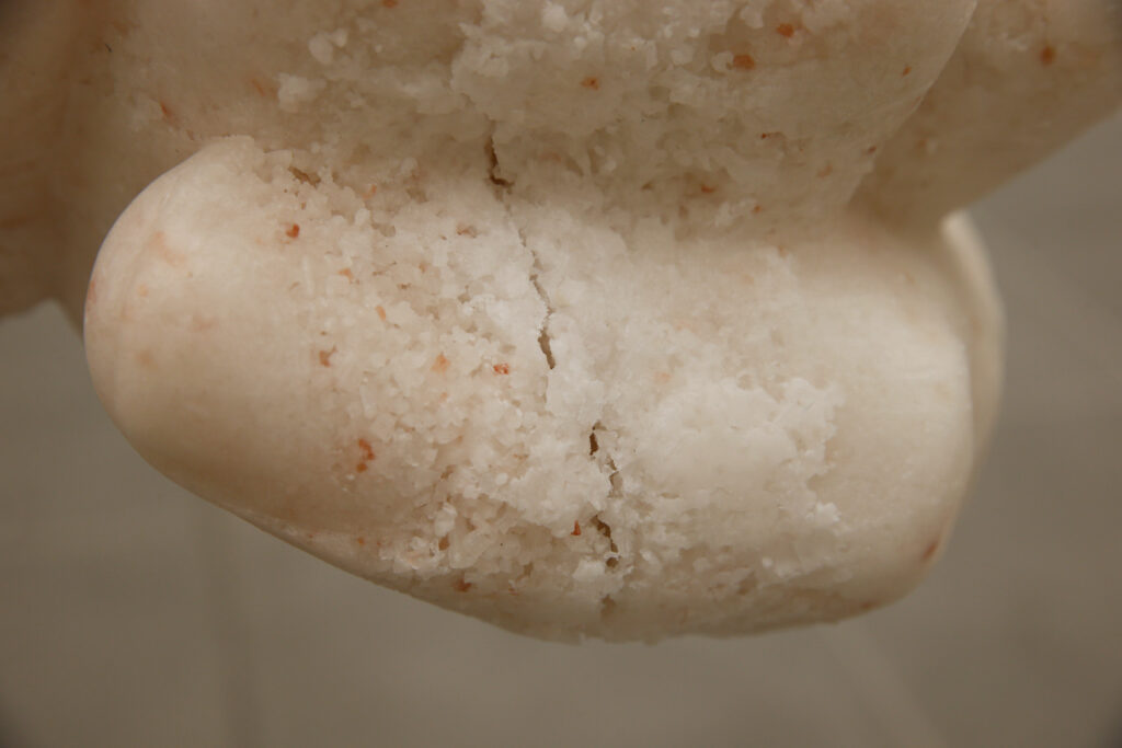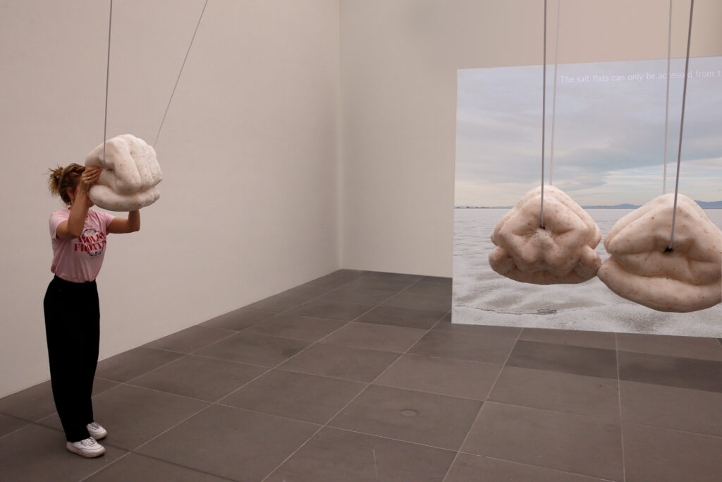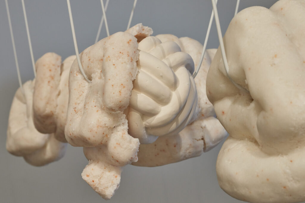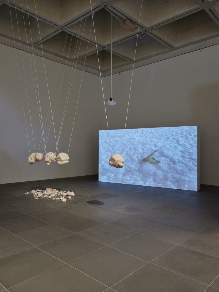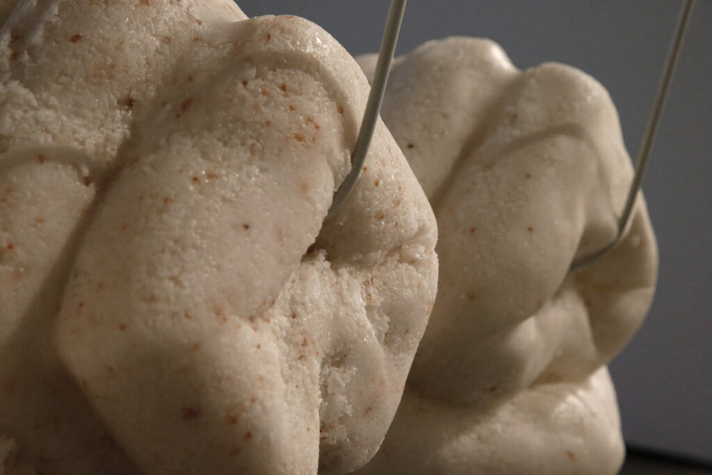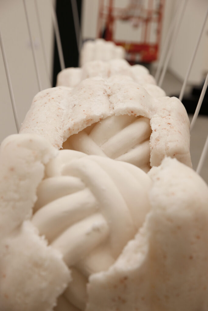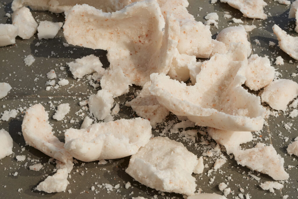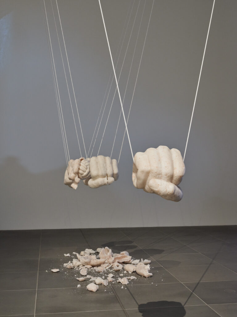 The sculptures made from salt are shaped like double-sided fists. Each contains a ceramic core formed like a knot. The symbol of the fist speaks to change, a revolutionary force and transformation, while the knot inside is unsolvable, infinite, eternal. Five of the six fists form the Newton’s Pendulum and break and change every time the sculpture is activated: the cocoon of the salt fists breaks open with every swing and reveals the ceramic knot while the salt crust falls to the floor where it remains as a relic of change. The activation is repeated weekly, each time changing the sculpture and movement irreversibly. The sixth sculpture is installed after a greater gap. It is outside the system and cannot be hit by the swinging system. It remains unchanged while it formally indicated the movement.