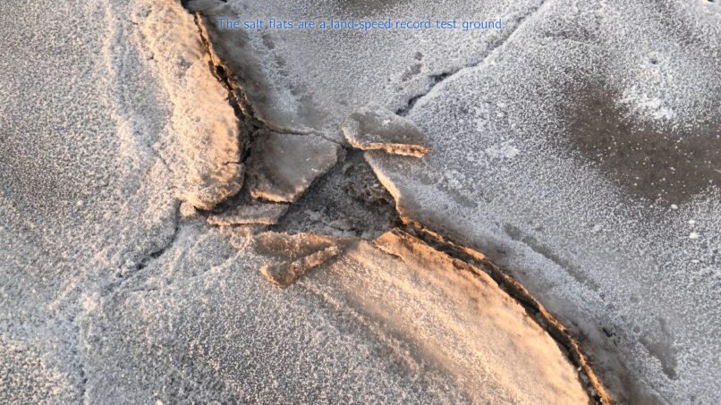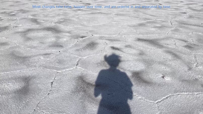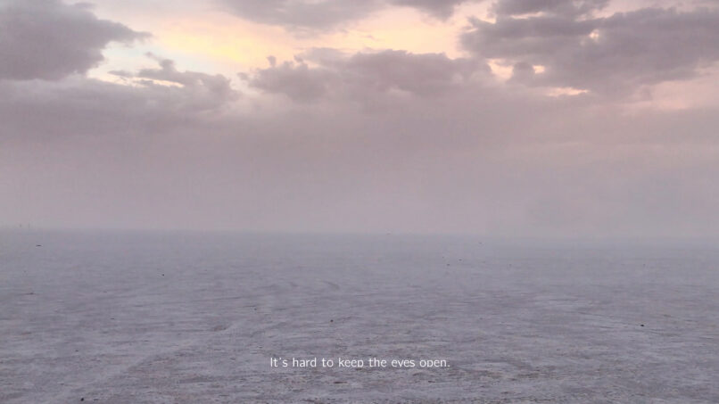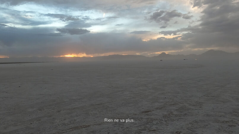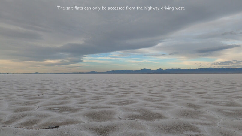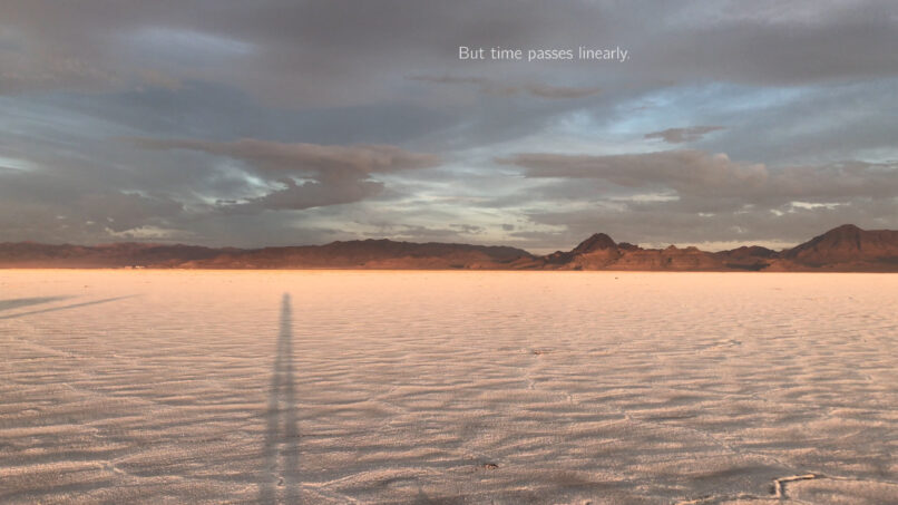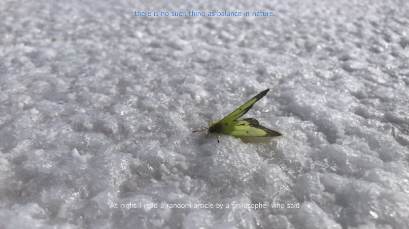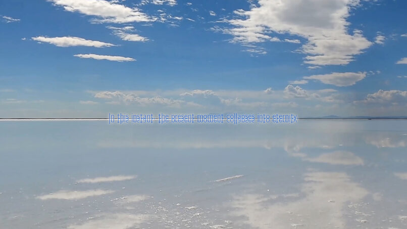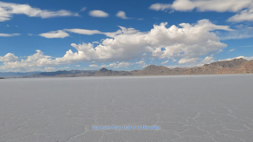 Filmed at the Bonneville Salt Flats, the dried remains of an primeval lake – today, a vast salt desert, which serves as a land-speed-record test ground and for mining salt and using my shadow and a butterfly (Colias philodice) as motifs, the video explores concepts of the here and now, the there and then, the relationship of change and time and one’s own mutable standpoint in in a world that is undergoing devastating changes due to human influences, and so touches upon the human made climate catastrophe through an intra- and intertextual elliptical narrative carried by a voice-over and sounds generated by a text-to-sound-program as well as animated subtitles.
