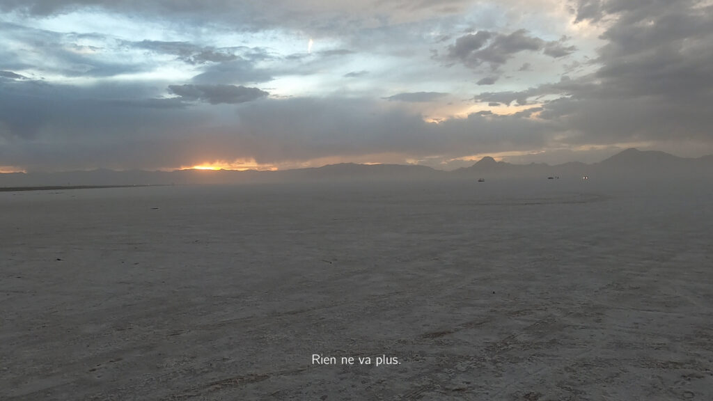 Filmed at the Bonneville Salt Flats, the dried remains of an primeval lake – today, a vast salt desert, which serves as a land-speed-record test ground and for mining salt and using my shadow and a butterfly (Colias philodice) as motifs, the video explores concepts of the here and now, the there and then, the relationship of change and time and one’s own mutable standpoint in in a world that is undergoing devastating changes due to human influences, and so touches upon the human made climate catastrophe through an intra- and intertextual elliptical narrative carried by a voice-over and sounds generated by a text-to-sound-program as well as animated subtitles.