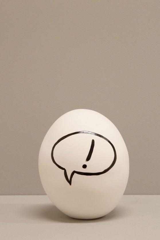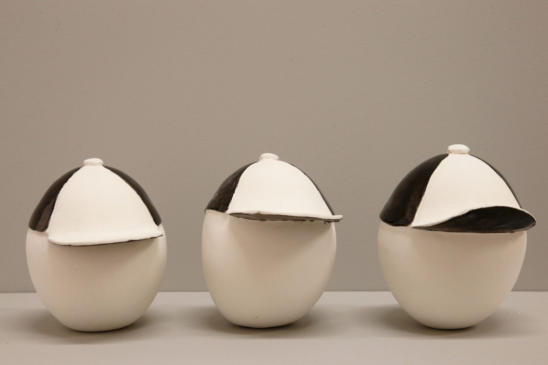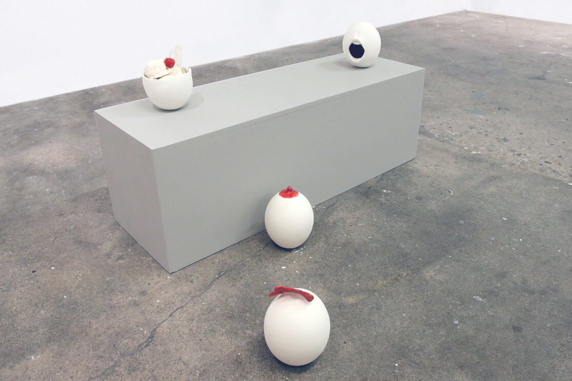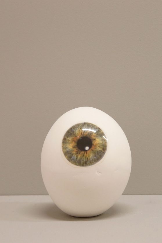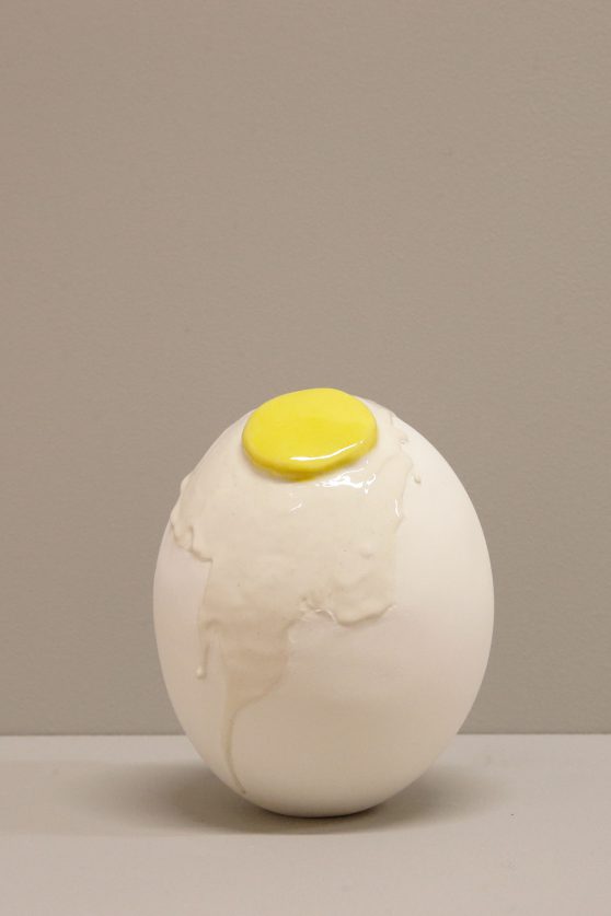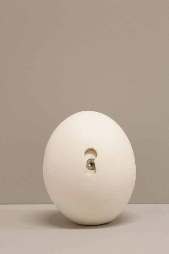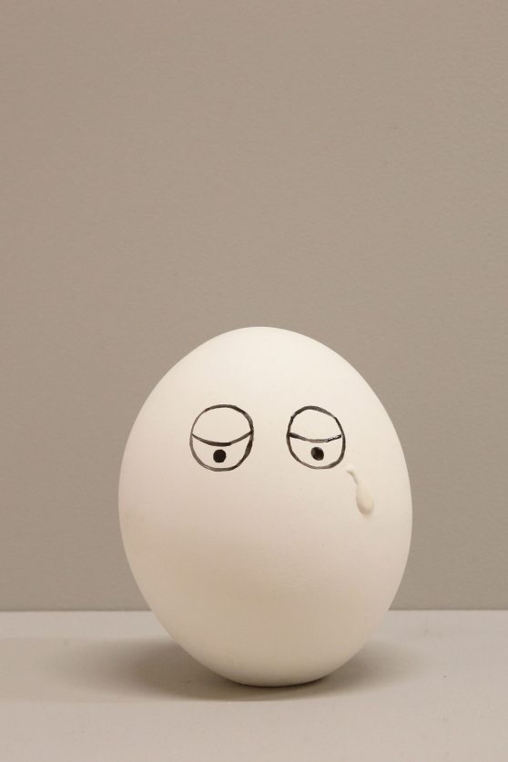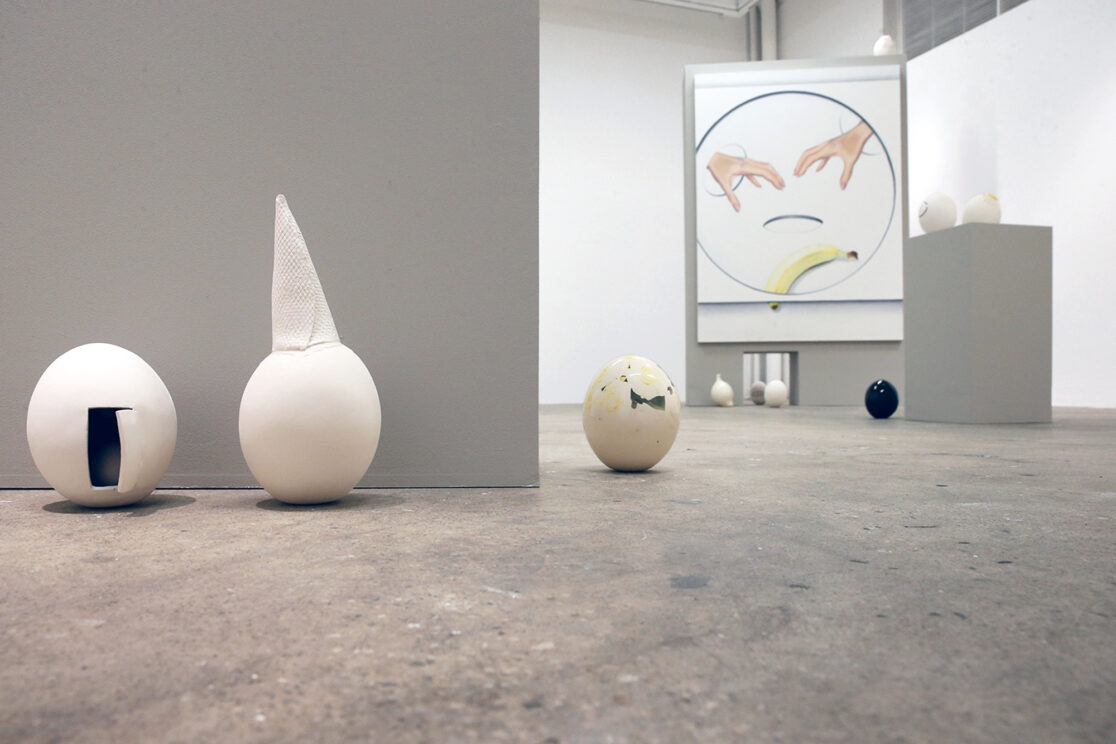 These 3 dozens ceramic eggs are all variations of the same cast of an ostrich egg. The series evolved from an interlingual pun between the German word Ei which means Egg and the English words I, Eye, which are pronounced similarly. (Ei scream, Ice cream, I said, Eye said, Ei ball and so on) From there the sculptures explore different kinds of ideas: linguistic, content related, comical, formal, semiotic, etc.
