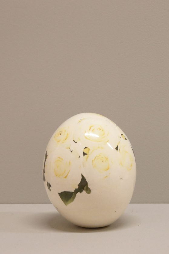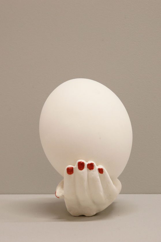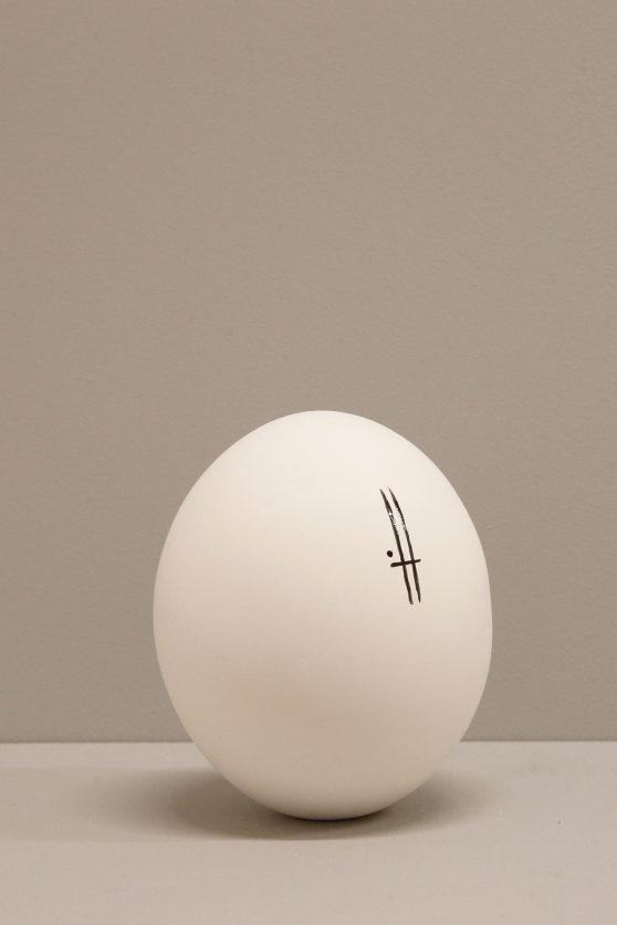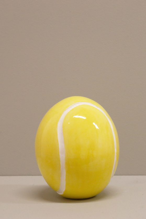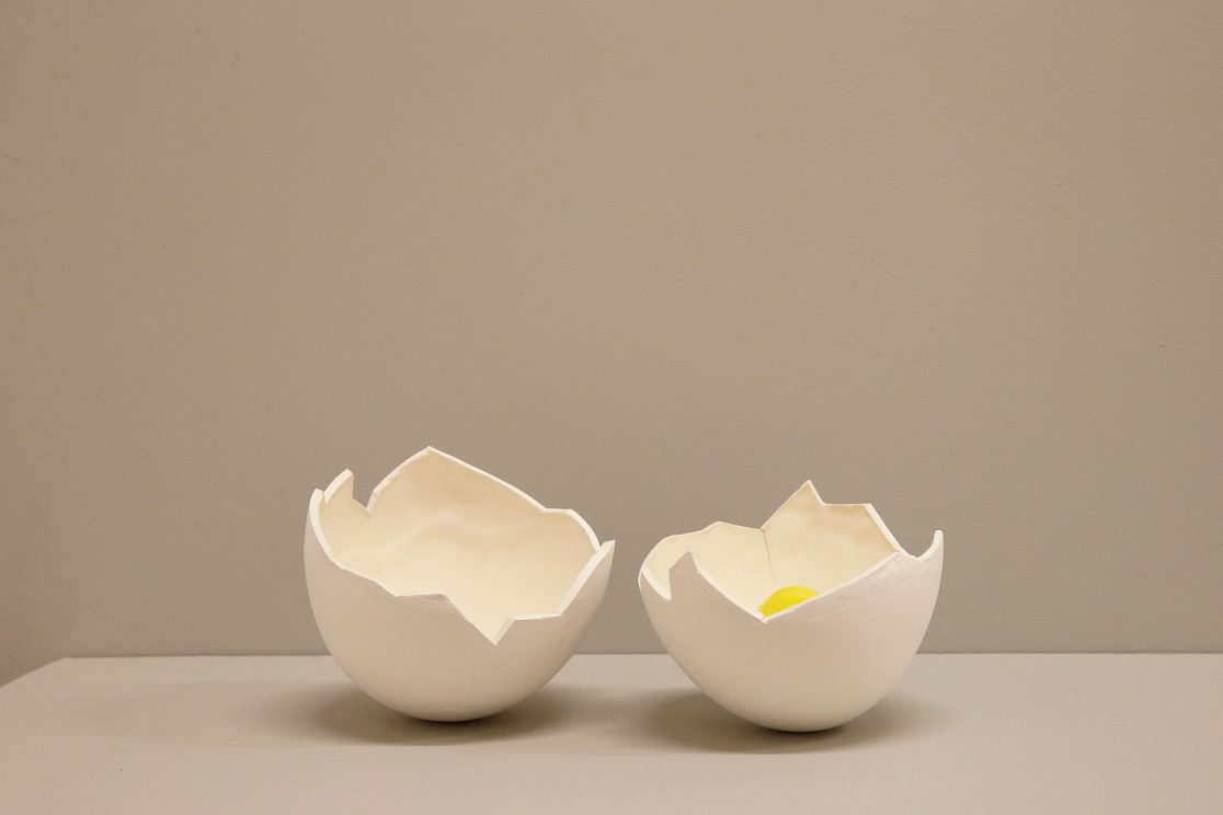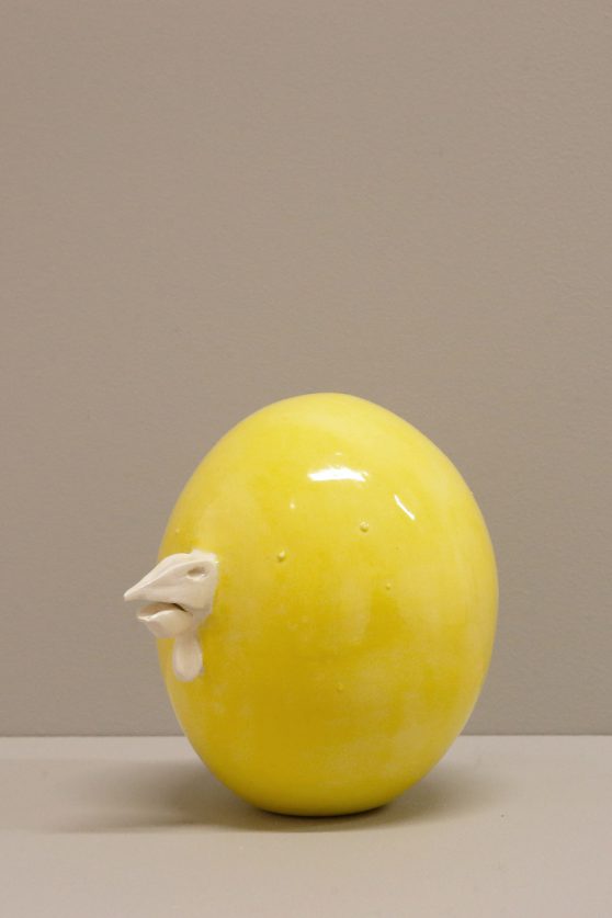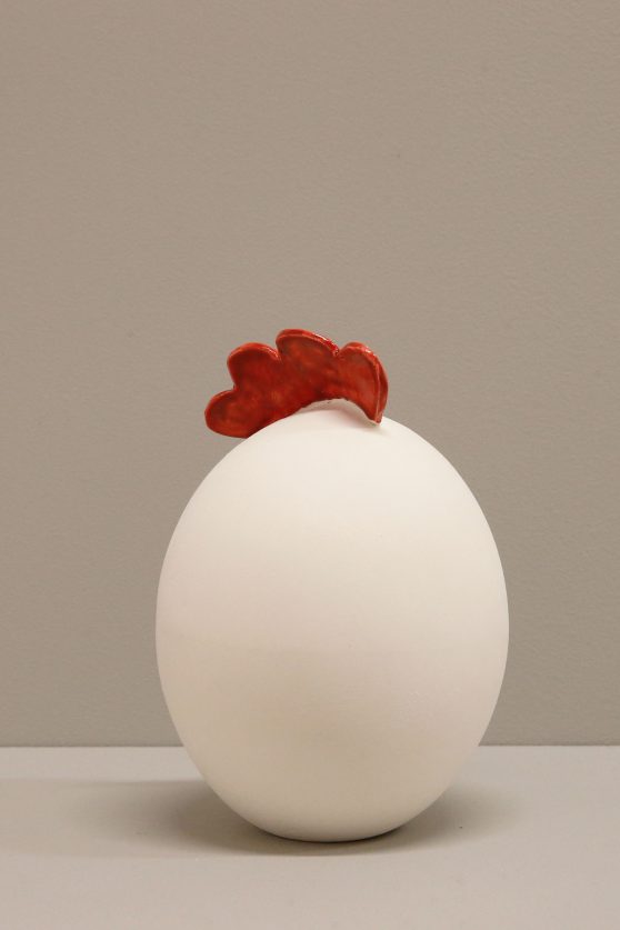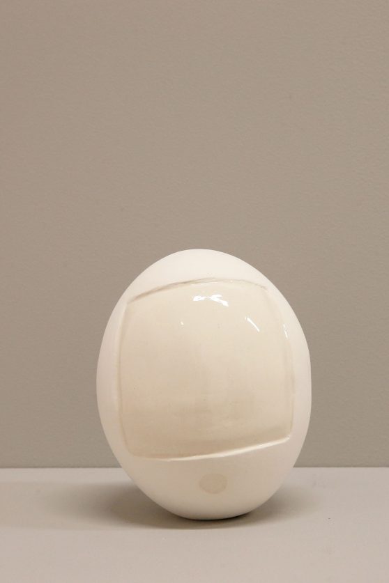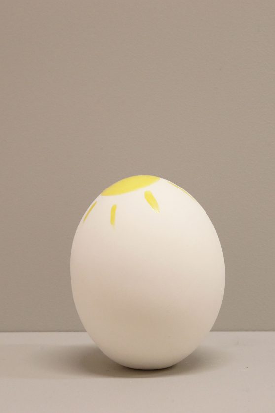 These 3 dozens ceramic eggs are all variations of the same cast of an ostrich egg. The series evolved from an interlingual pun between the German word Ei which means Egg and the English words I, Eye, which are pronounced similarly. (Ei scream, Ice cream, I said, Eye said, Ei ball and so on) From there the sculptures explore different kinds of ideas: linguistic, content related, comical, formal, semiotic, etc.