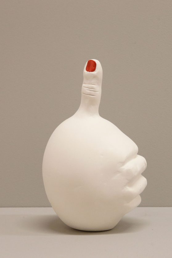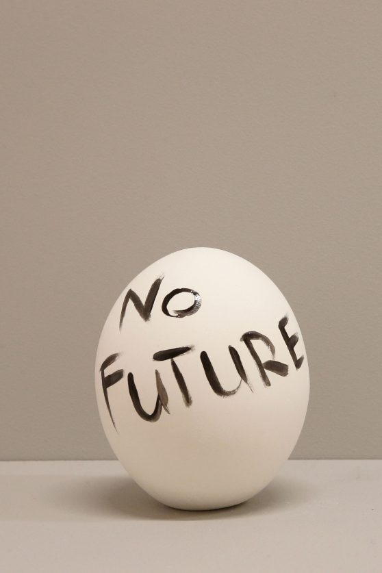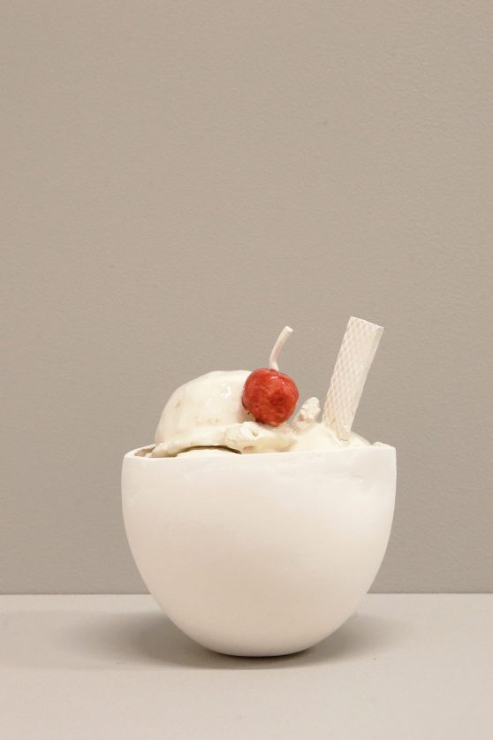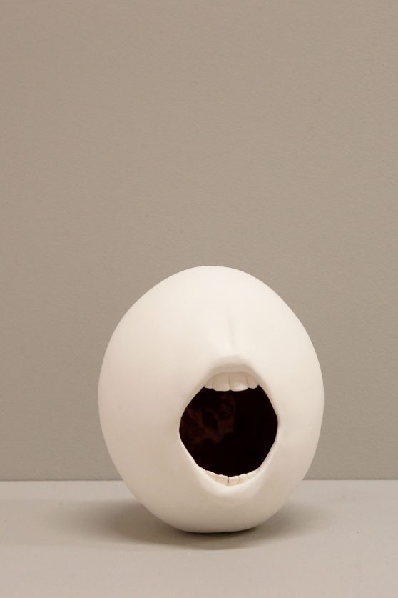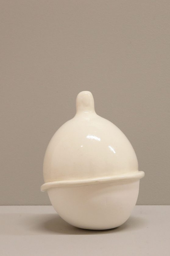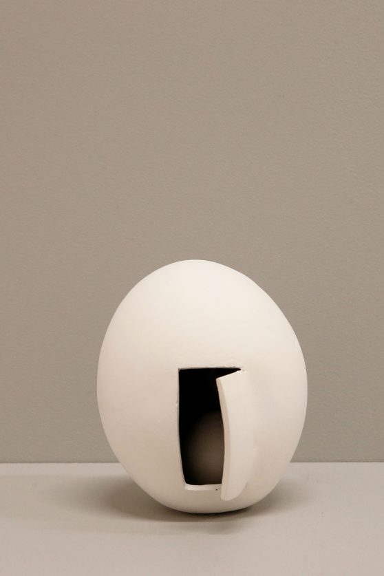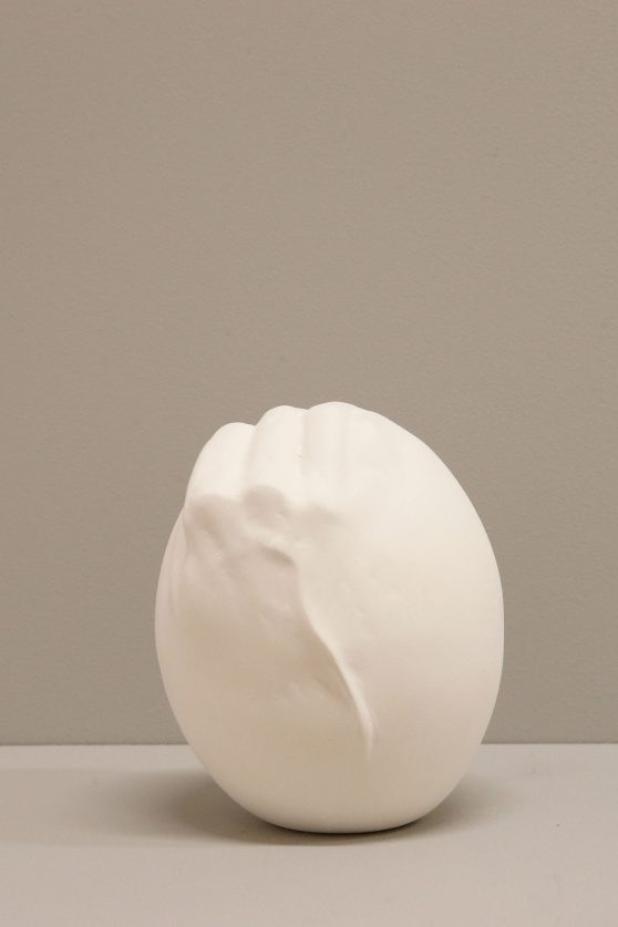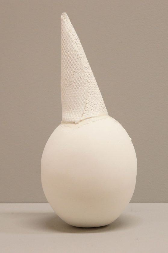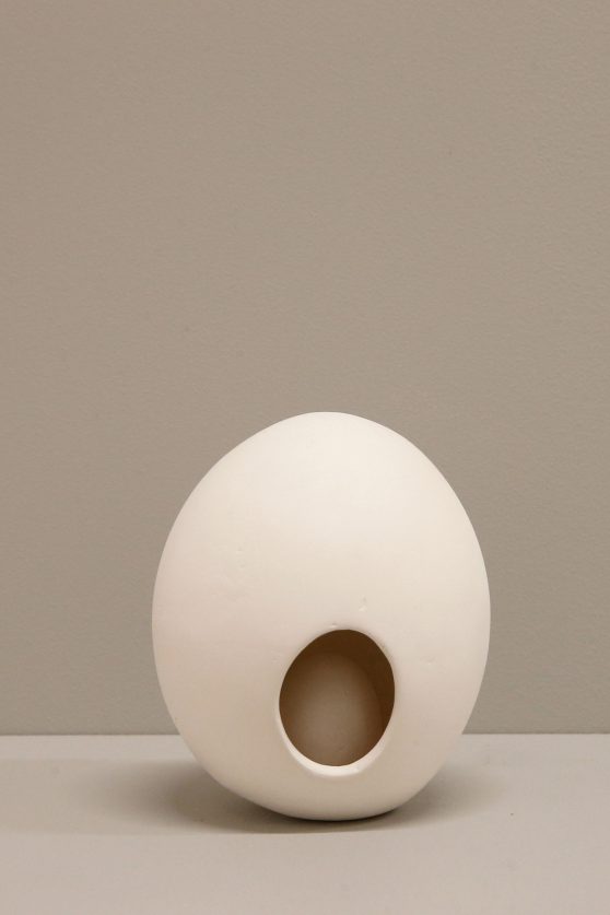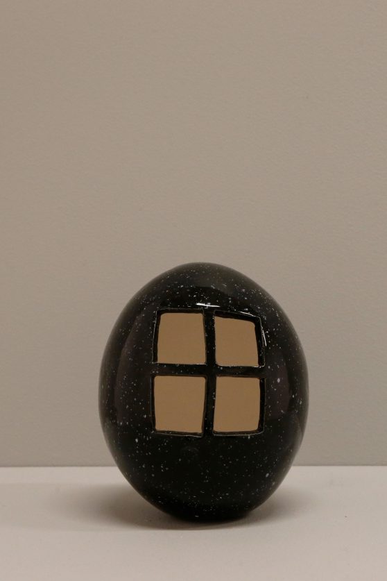 These 3 dozens ceramic eggs are all variations of the same cast of an ostrich egg. The series evolved from an interlingual pun between the German word Ei which means Egg and the English words I, Eye, which are pronounced similarly. (Ei scream, Ice cream, I said, Eye said, Ei ball and so on) From there the sculptures explore different kinds of ideas: linguistic, content related, comical, formal, semiotic, etc.