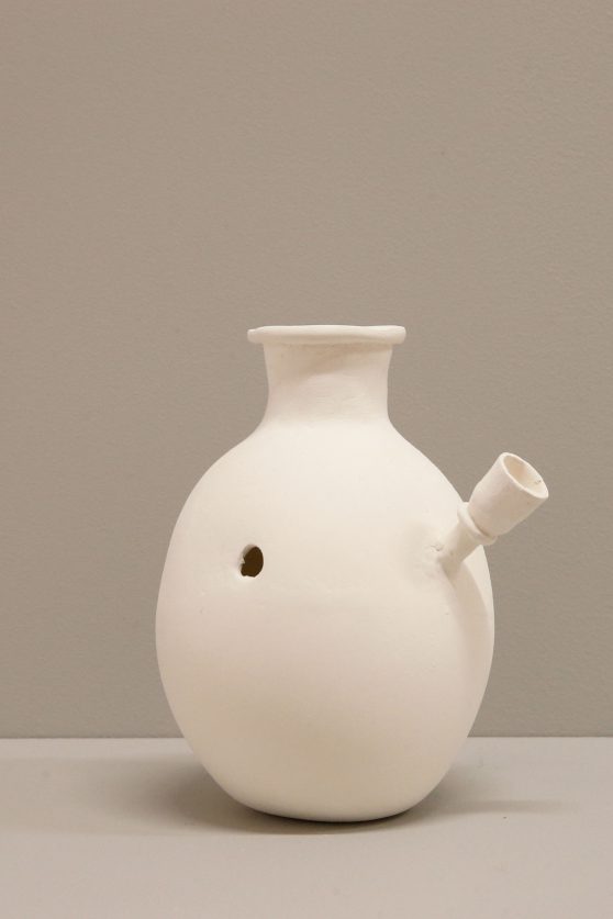The series is displayed on geometric modules or shelves, creating an environment or display in which they are put in a spatial relationship to each other, as well as to the space.