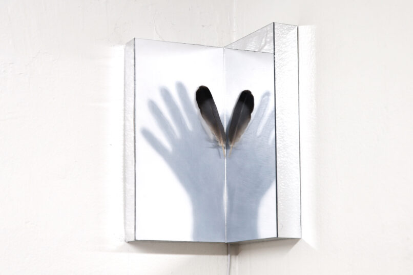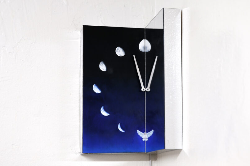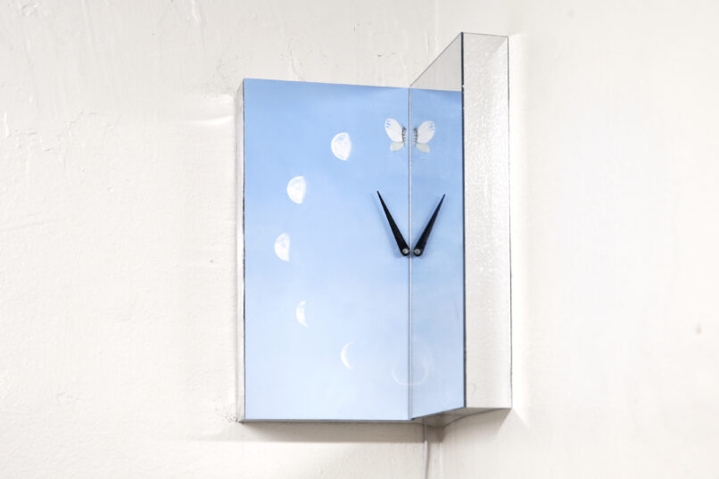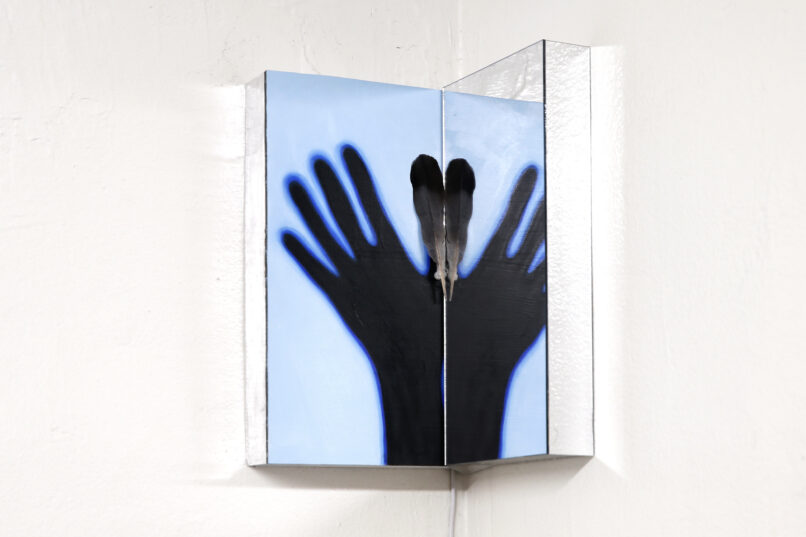 oil on aluminum, micro controller board, minimotor, acrylic mirror on wood