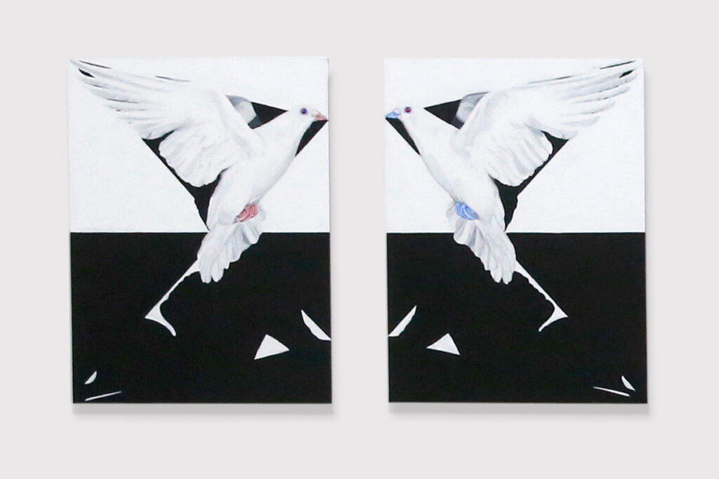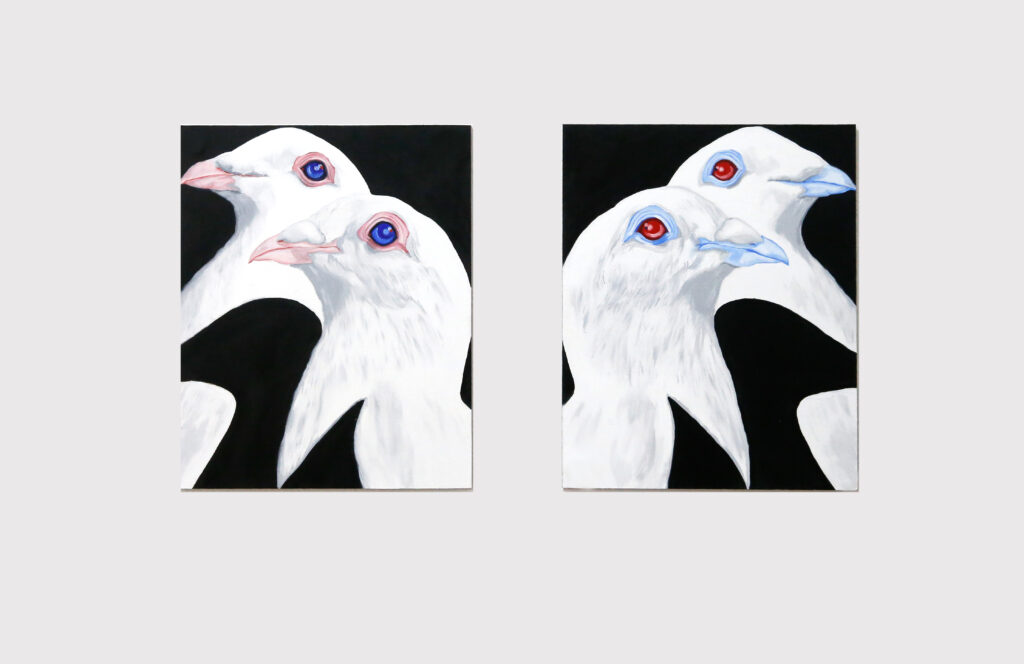 My paintings literally and metaphorically connect recurring motifs like butterflies, birds, shadows, and hands with strings, patterns, and words to create multiple figurative and linguistic layers of meaning through concepts such as simultaneity, mirroring, ambiguity or two-sidedness.