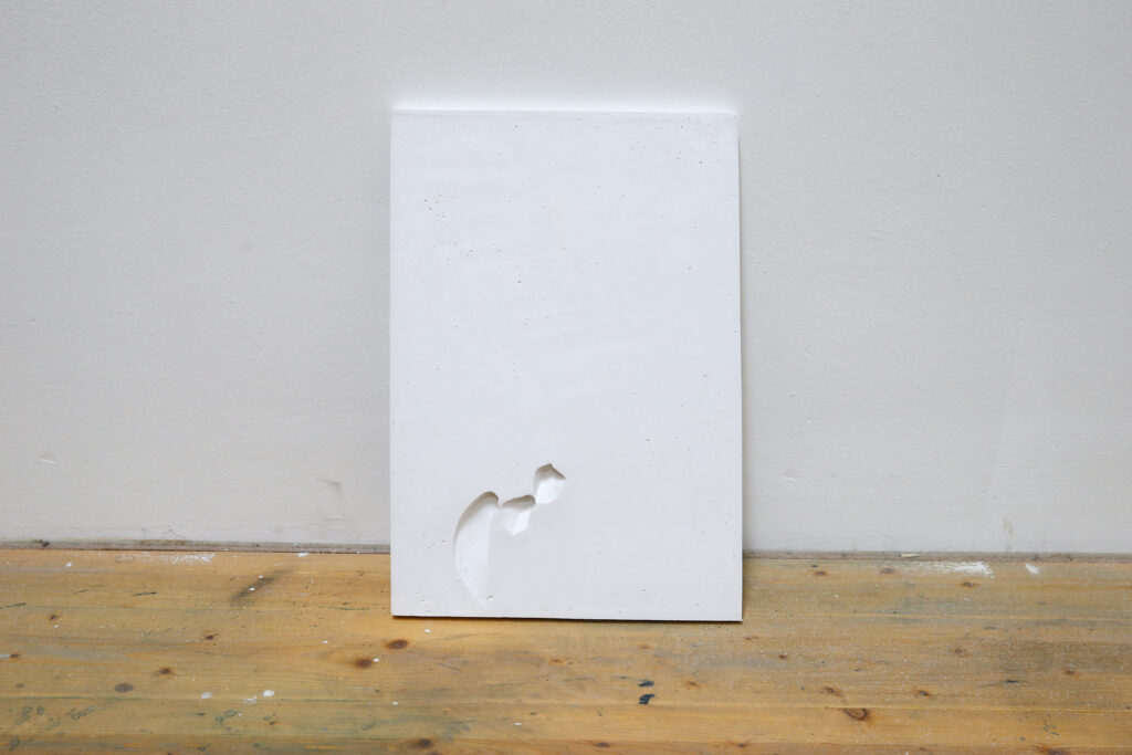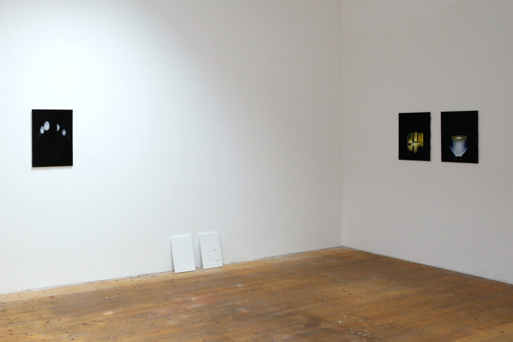 This work is kind of in between – there is of a gap between the original subject and its appearance. It might look serious but it’s also humorous. It might appear to have a mystical meaning but the subject is banal. The work I installed in the space is called untitled pug marks. What looks like fossilized traces or footprints of long extinct creatures and resemble Neil Armstrong’s footprint on the moon are the imprints of bananas in plaster. Along with it, I showed three still life paintings, with apparently cosmic motifs, which actually show dramatically lit melons and sponges while only one painting actually pictured the moon.
