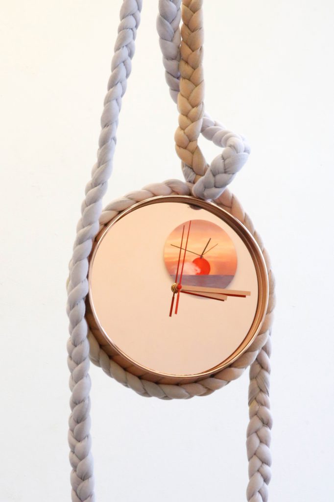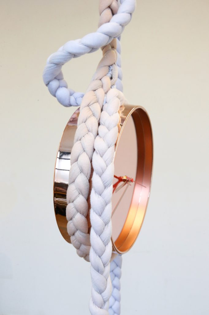 My heart is not a clock is a double-sided clock with two mirrored faces. While the hands on the one side move smoothly and continuously clockwise, the hands on the other side tick backwards so that not only the viewer‘s face is mirrored in the clock, but the clock, so to speak, mirrors itself. It hangs from a braid, a simple structure created by following strict axioms.