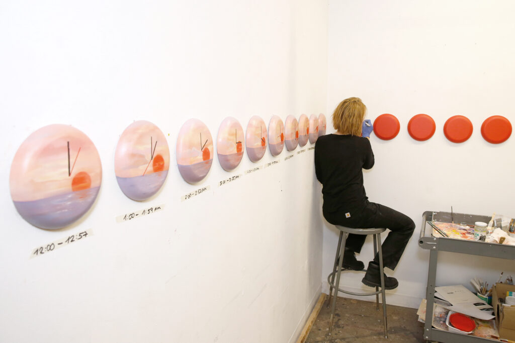During 12/8/2019, noon -12/9/2019, noon I painted 24 identical paintings of a wall clock my parents used to have over our kitchen table after my memory. The clock pictured an illustrative sunrise/sunset over the ocean. I constantly wondered about this strange image that just made sense with the actual time twice a day.
