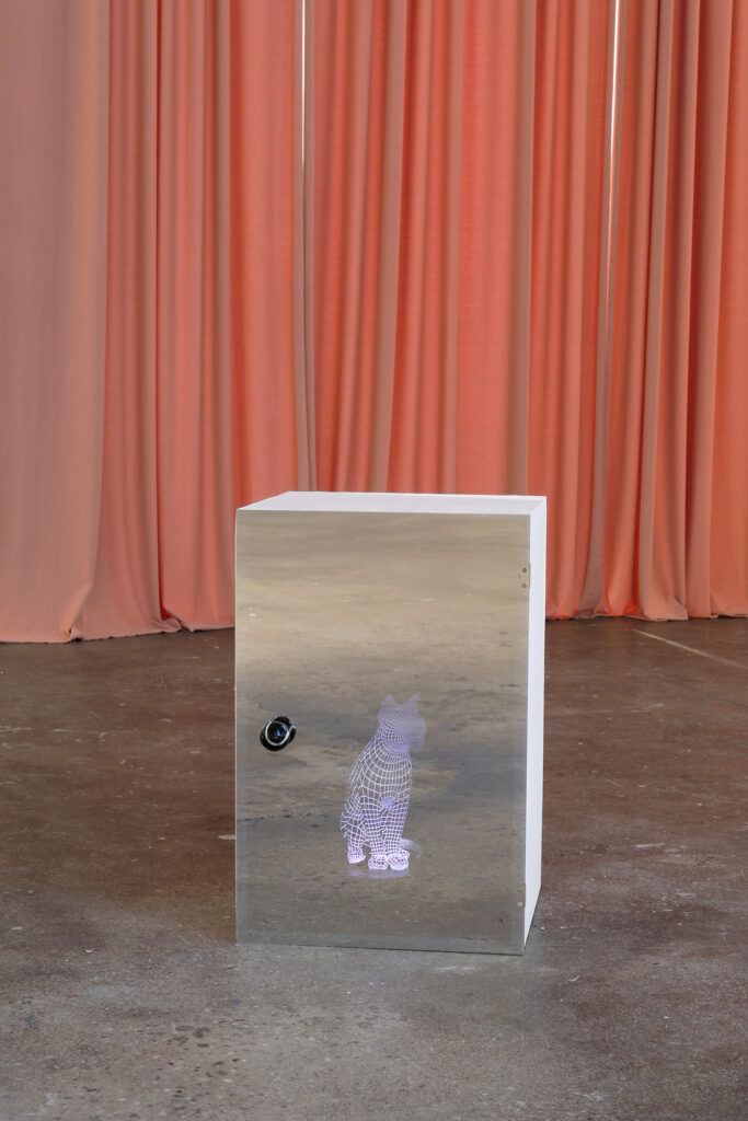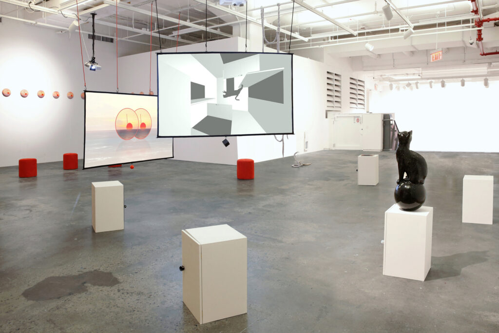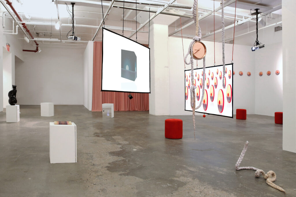 To watch the video Space is viewers sit next to a ceramic cat sculpture on small mdf cabinets with doors, as the imagery of the video mostly depicts opening doors, nesting cubes and cats. The videos are accompanied by several other works in different media picking up conceptual and pictorial elements of the videos.