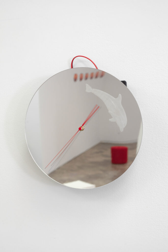 This clock titled pas un poisson has a second hand that ticks backwards. The mirrored face of the clock shows an image of a dolphin, which also appears in other works of this body of work around time perception. While dolphins of course are no fish, it loosely references Duchamp’s Roto Relief Poisson Japonais (also in the title). The whole clock is connected to a motor so that it rotates twice per minute in clockwise direction. In this way, while still ticking counterclockwise the second hand describes a minute clockwise. The dolphin “swims” two rounds per minute but just meets the second hand every full minute.