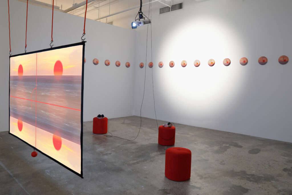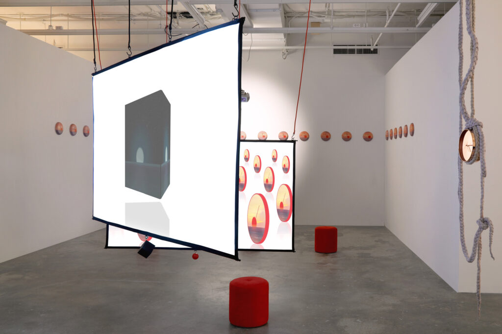 The installation brings together works in different media which explore aspects of the perception of time and space. For each video of the 2 channel video installation I built a specific seating environment referring to the respective video’s pictorial imagery. The video Time is mainly displays an animated sunrise/sunset over the ocean with a red sun disk and a red clock. The seats, round pouches on lazy susans, cite this spinning red disk.