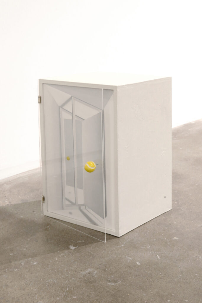 Please take up space is a seating environment and display. It consists of five white mdf cabinets. Each cabinet has a handmade ceramic knob, a tiny tennis ball. One of the cabinets serves as a pedestal to display the ceramic sculpture Thank you for your participation in my success (Félicette), the other four are meant as seats for viewers of the video. While they are identical in size their interiors are different: One cabinet displays a 17 x 11inch oil painting of an optical illusion of a door behind acrylic glass, another cabinet has a gridded cat hologram behind a two way mirror while the others just have closed doors that leave us guessing what’s inside (Maybe a cat? And if so, is it dead or alive?).