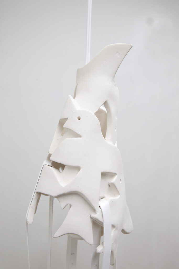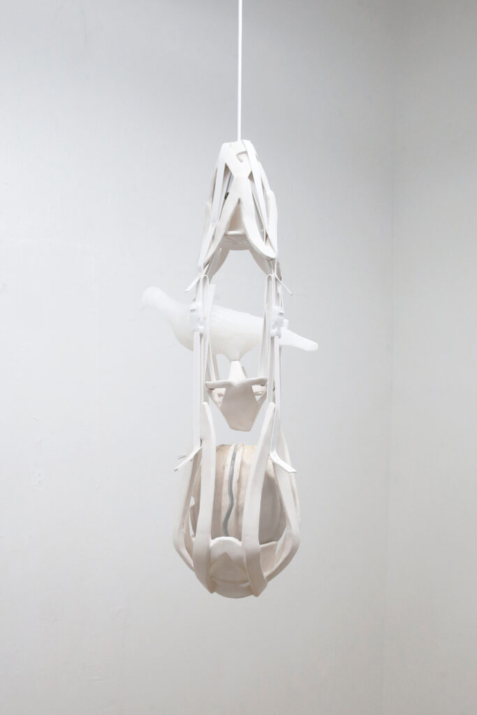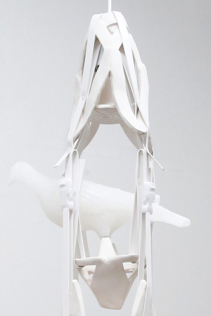 The multiple-part sculptures contain heating elements. During the run of the exhibition, a cast paraffin bird (respectively. egg) melts into the lower part of the sculpture that functions as an egg (bird) shaped mold to become an egg (bird) again and vice versa.